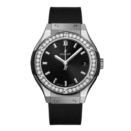 Hublot Classic Fusion Titanium Diamonds 33 mm, Satin-finished and Polished Titanium case, Polished Titanium Set with 36 Diamonds for 0.8ct with 6 H-shaped Titanium Screws bezel, 50m or 5 ATM water resistance, Sapphire with Anti-reflective Treatment crystal, Satin-finished Black Sunray dial, HUB2912 Quartz Movement, 3 to 5 Years power reserve, Black Lined Rubber Straps and Stainless Steel Deployant Buckle Clasp.