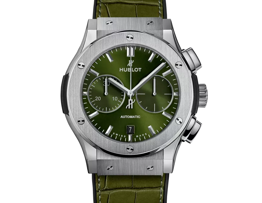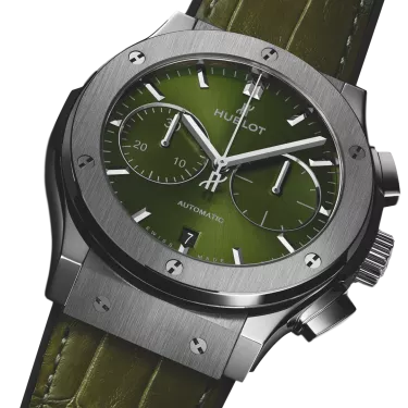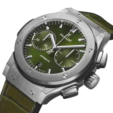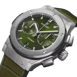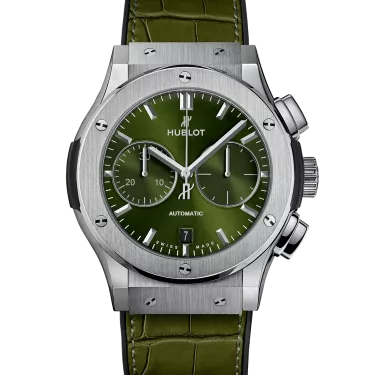 Hublot Classic Fusion Titanium Green 45 mm Satin-finished and Polished Titanium case; Satin-finished and Polished Titanium bezel with 6 H-shaped Titanium Screws; Sapphire with Anti-reflective Treatment; Satin-finished Green Sunray dial; Black Rubber and Green Alligator Straps; Stainless Steel Deployant Buckle Clasp; HUB1143, Self-winding and Chronograph Movement; 42 Hours power reserve and 50m or 5 ATM water resistance.