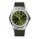 Hublot Classic Fusion Titanium Green, Satin-finished and Polished Titanium case, Satin-finished and Polished Titanium with 6 H-shaped Titanium Screws bezel, 50m or 5 ATM water resistance, Sapphire with Anti-reflective Treatment, Satin-finished Green Sunray dial, HUB1110 Self-winding Movement, 42 Hours power reserve, Green Lined Rubber Straps and Stainless Steel Deployant Buckle Clasp.