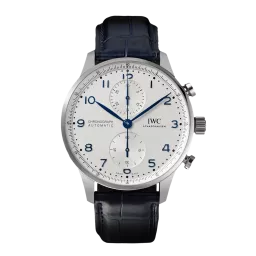 The Portugieser Chronograph is one of IWC Schaffhausen's most iconic models. With its compact diameter of 41 millimetres, it fits almost any wrist. However, the thin bezel gives one the impression of wearing a significantly larger watch. The clear, functional dial boasts applied Arabic numerals and slender Feuille hands. Printed with a quarter-second scale, the characteristic réhaut not only allows precise reading of the stop time but also reminds us of the Portugieser's origins as a nautical precision instrument for the wrist. This model features a stainless steel case, a silver-plated dial, as well as blue hands and appliqués; it is fitted with a blue alligator leather strap. Inside the sporty-elegant chronograph, the IWC-manufactured 69355 calibre is at work. The robust and precise chronograph movement in classic column-wheel design is visible through a sapphire-glass case back.