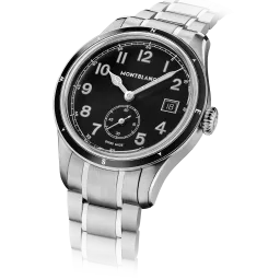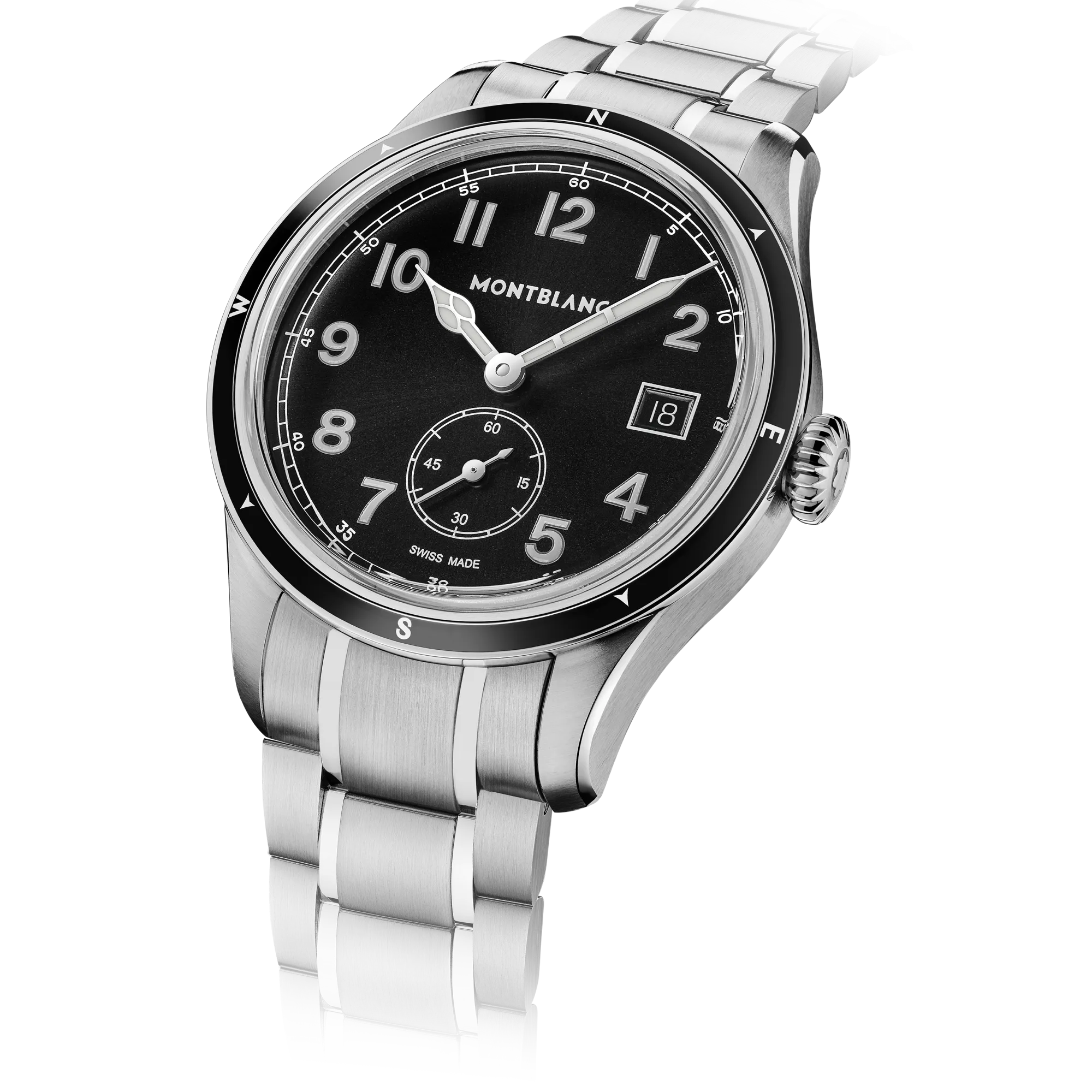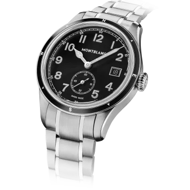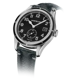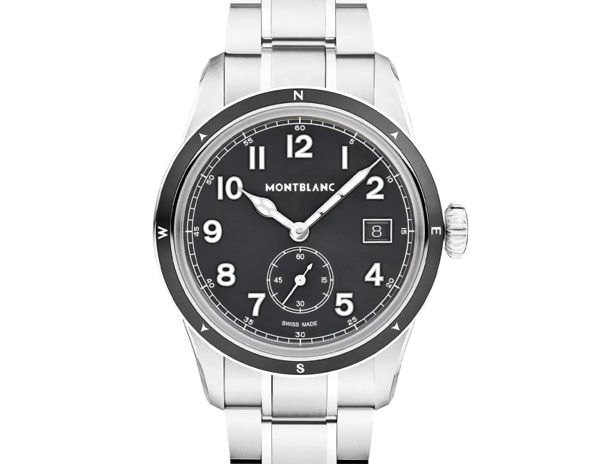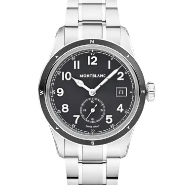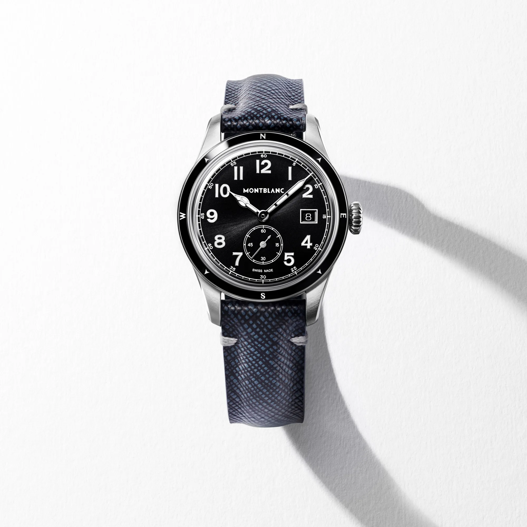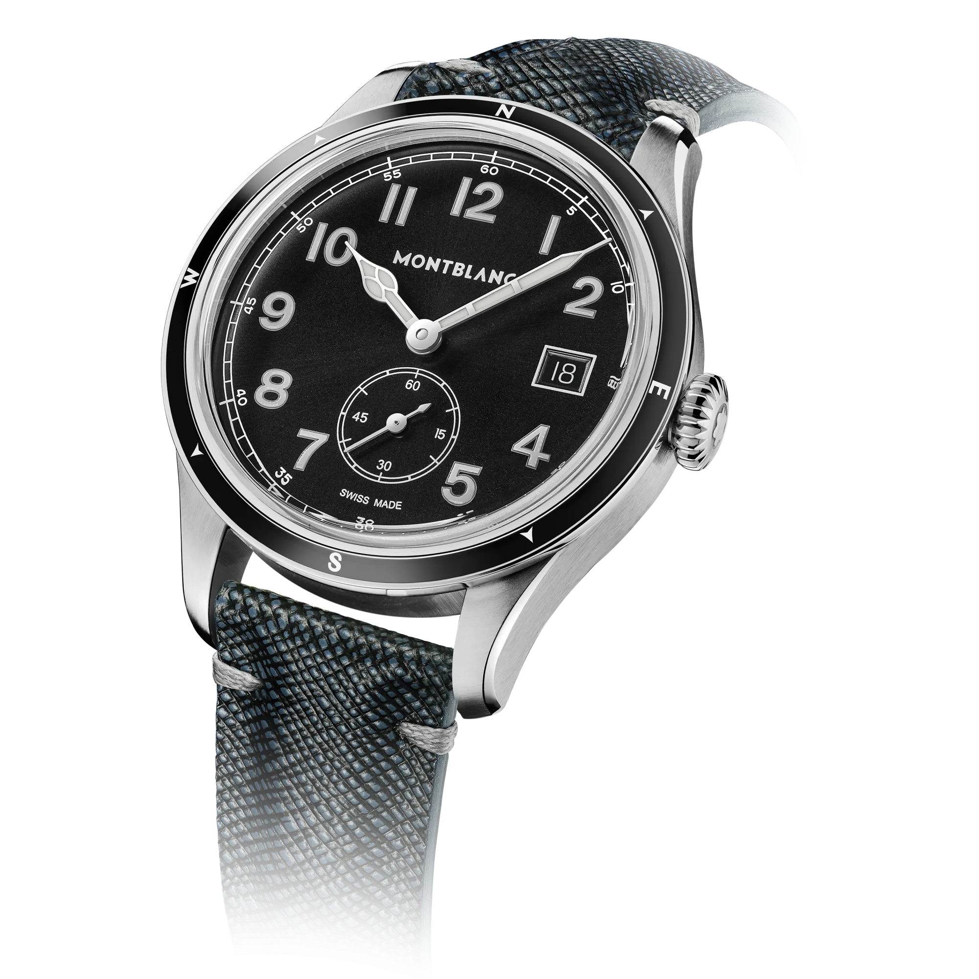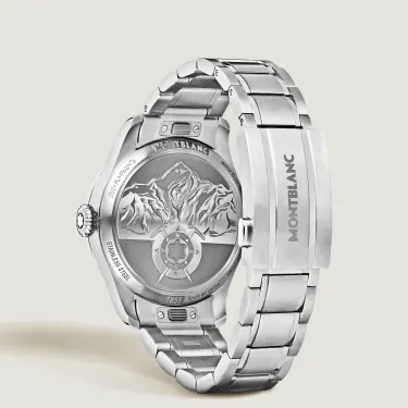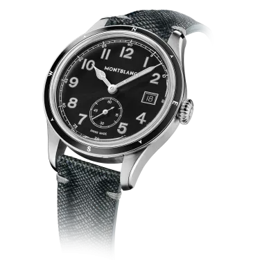 The Montblanc 1858 Automatic Date 0 Oxygen is housed in a 38 mm stainless steel case totally devoid of oxygen. It is completed by a fixed bezel with a black ceramic insert and luminescent cardinal points. The case back features the “Spirit of Exploration” special engraving. The timepiece is powered by the automatic calibre MB 24.16 and comes with a black dial with white luminescent rhodium-coated Arabic numerals and a small seconds indication. It is fitted with an interchangeable stainless steel bracelet and is provided with a second interchangeable blue and black Saffiano leather strap.