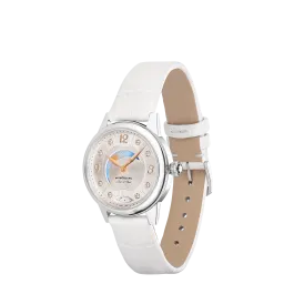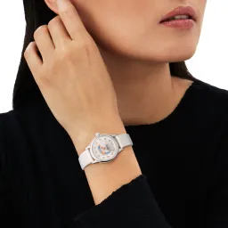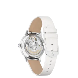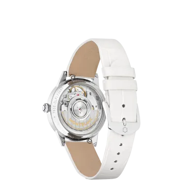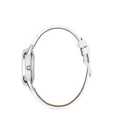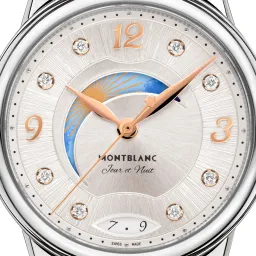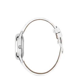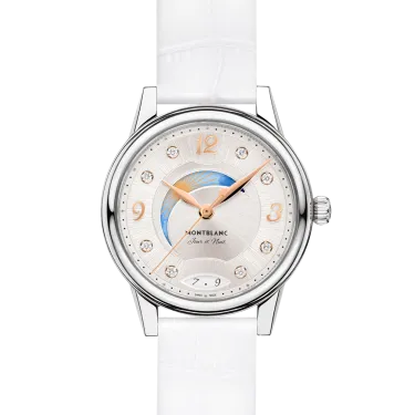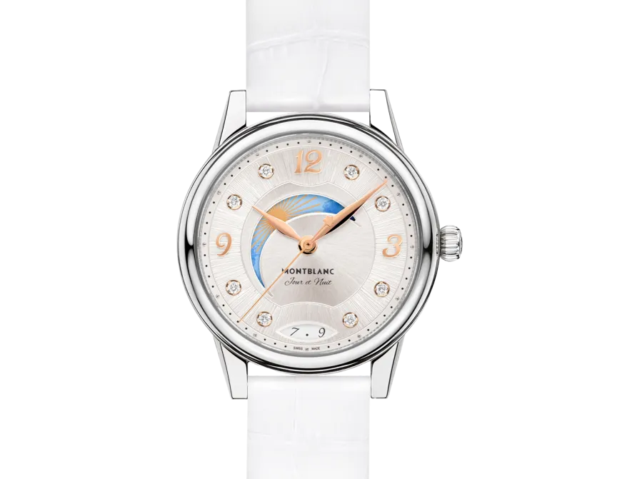 Delivering an elegant and feminine interpretation of the codes of Haute Horlogerie, the Montblanc Bohème Day & Night, inspired by the world of writing and watercolour painting, is presented in a 30 mm stainless steel case. It features an elegant brushed silver-white dial adorned with diamond hour markers and floral Arabic numerals, as well as rose gold-plated hands. Other refined details include a filet sauté pattern and an engraving technique known as ‘filé d'étoiles’. Powered by the MB 24.20 automatic calibre, this model displays the hours, minutes and seconds, as well as the date, shown in an almond-shaped aperture with handwritten numerals. The romantic font has also been used on the dial for the words ‘Day and Night’. The celestial day & night complication shows the changing colours of the sky over a 24-hour period and adds a romantic and artistic touch to the watch, as it is created in watercolour. This timepiece is equipped with an interchangeable white calfskin strap with an alligator print and an additional strap.