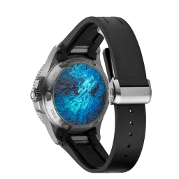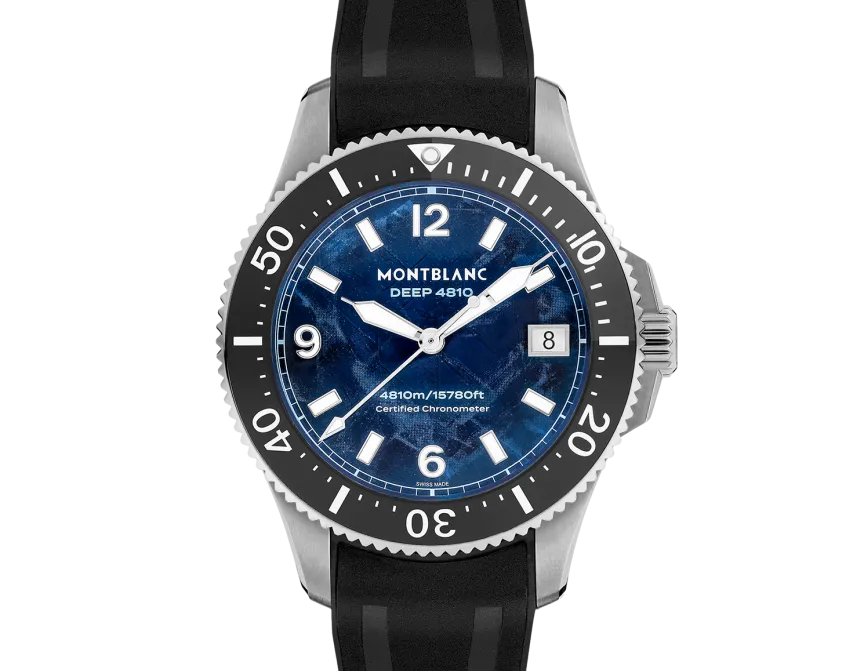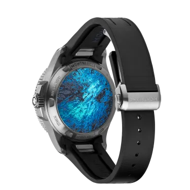 After aiming for the highest peaks, Montblanc explores the marine world 4,810 metres below sea level with the Montblanc Iced Sea 0 Oxygen Deep 4,810. The glacier motif on the dial is inspired by the Mer de Glace, the main glacier in the Mont Blanc massif. Its texture is the result of an almost forgotten ancestral technique called gratté-boisé. Housed in a 43 mm titanium case completely devoid of oxygen, with a shield protecting the screw-down crown, this diving watch has a case back decorated with a 3D engraving of the view offered to divers who venture under the ice. The watch is powered by Montblanc's COSC-certified MB 29.29 automatic movement, which has a power reserve of approximately five days and complies with the ISO 6425 standard for scuba diving. It is water-resistant to 4,810 metres.