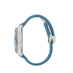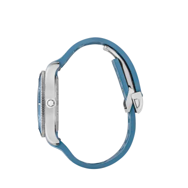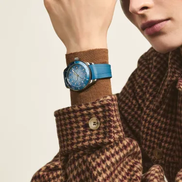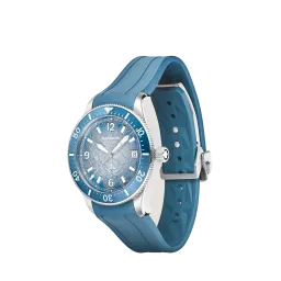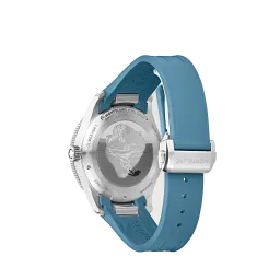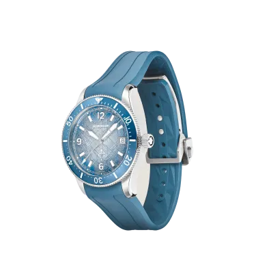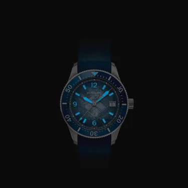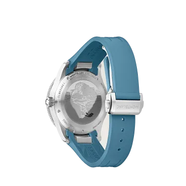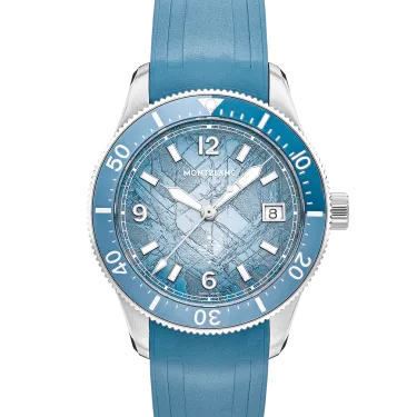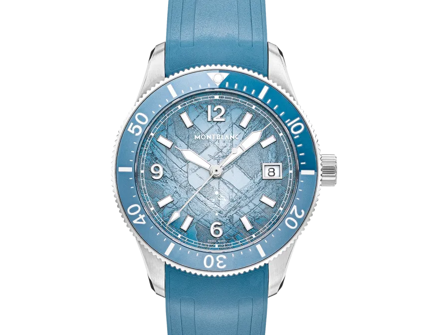 The Montblanc Iced Sea Automatic Date 0 Oxygen with blue sfumato glacier pattern dial gives the impression of looking into the depths of a glacier. Inspired by the Mer de Glace, this glacial texture was achieved using an almost-forgotten ancestral technique called gratté-boisé. The timepiece is housed in a 38 mm stainless steel case totally devoid of oxygen and comes with a unidirectional rotatable bezel with bi-colored blue anodized aluminium insert, a 3D engraving on the case back, and an interchangeable blue rubber strap with fine adjustment system. The timepiece conforms to the ISO 6425 norm for scuba diving and comes with a water resistance of 300 meters.