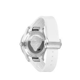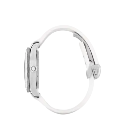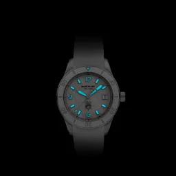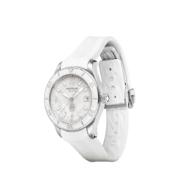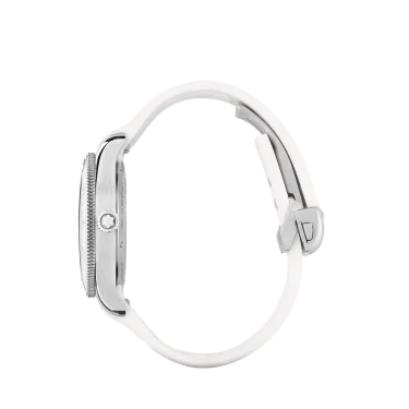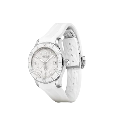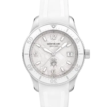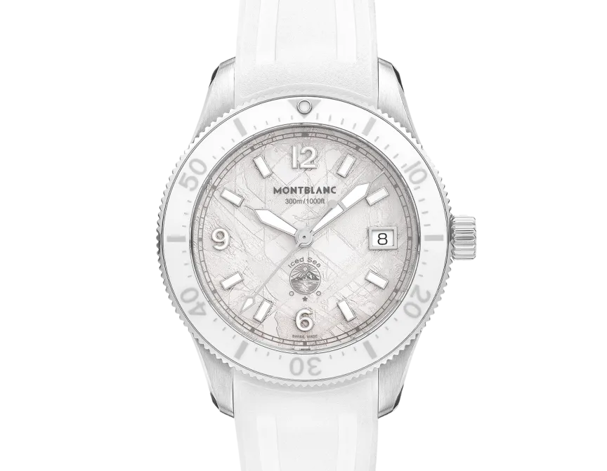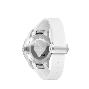 The Montblanc Iced Sea Automatic Date 0 Oxygen with white glacier pattern dial gives the impression of looking into the depths of a glacier. Inspired by the Mer de Glace, this glacial texture was achieved using an almost-forgotten ancestral technique called gratté-boisé. The timepiece is housed in a 38 mm stainless steel case totally devoid of oxygen and comes with a unidirectional rotatable bezel with white ceramic insert, a 3D engraving on the case back, and an interchangeable white rubber strap with fine adjustment system. The timepiece conforms to the ISO 6425 norm for scuba diving and comes with a water resistance of 300 meters.