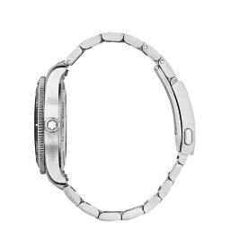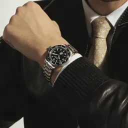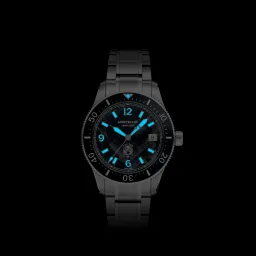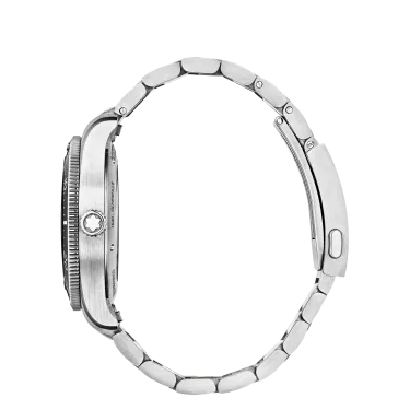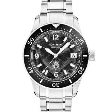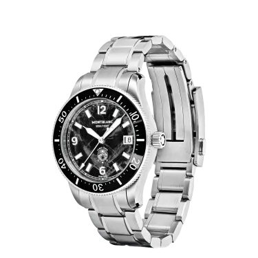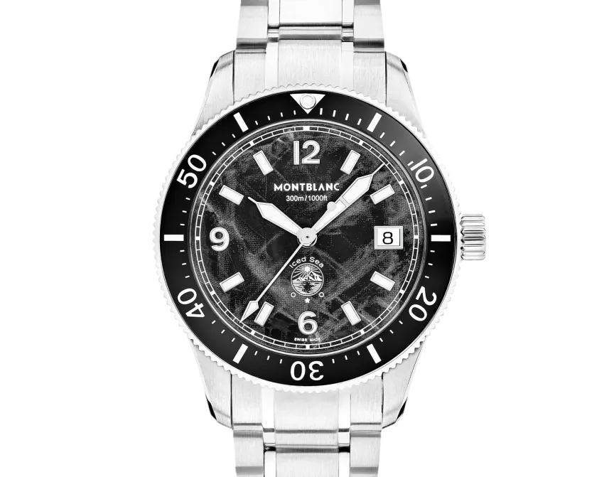 The Montblanc Iced Sea Automatic Date 0 Oxygen with a black glacier pattern dial gives the impression of looking into the depths of a glacier. Inspired by the Mer de Glace, this glacial texture was achieved using an almost-forgotten ancestral technique called gratté-boisé. The timepiece is housed in a 38 mm stainless steel case totally devoid of oxygen and comes with a unidirectional rotatable bezel with a black ceramic insert, an embossed case back, and an interchangeable stainless steel bracelet with a fine adjustment system. The timepiece conforms to the ISO 6425 norm for scuba diving and is water resistant to 300 metres.