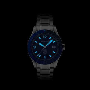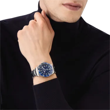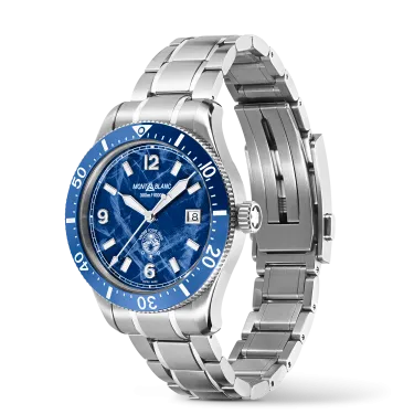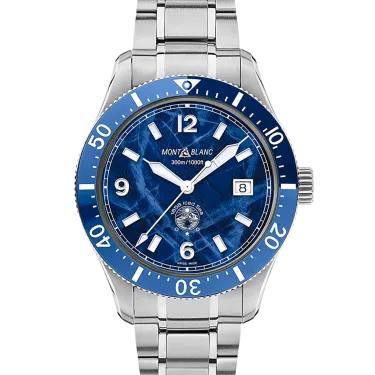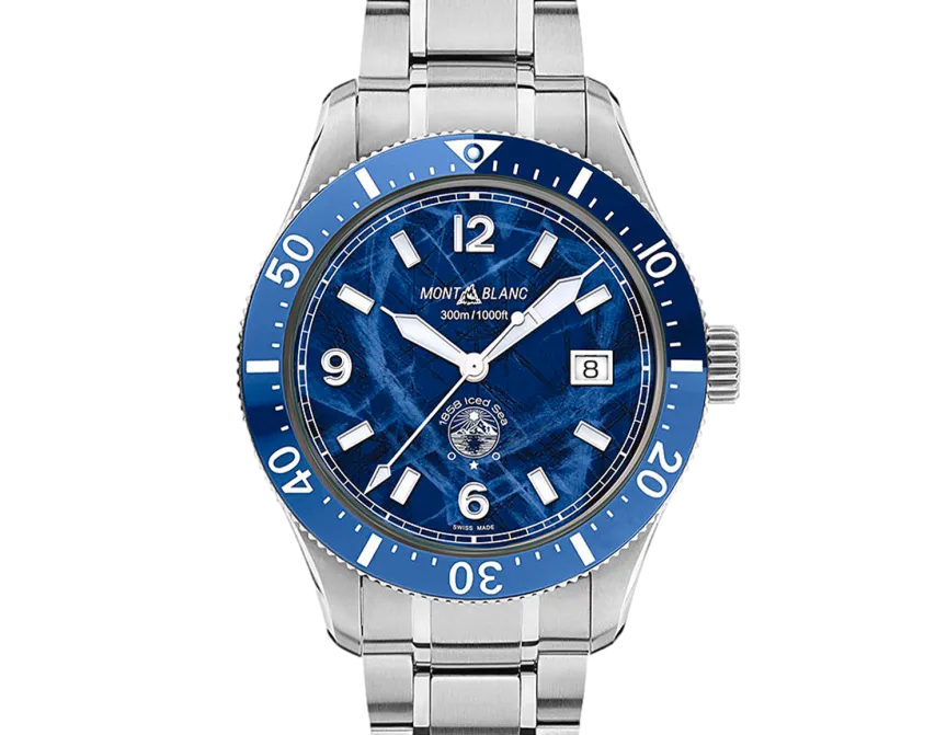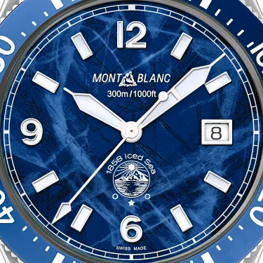 The first-ever sports diving watch for Montblanc, the Montblanc Iced Sea Automatic Date features a glacier pattern dial that gives the impression of looking into the depths of a glacier. This blue glacial pattern dial is inspired by the Mer de Glace - Sea of Ice - the main glacier of the Mont-Blanc Massif. Its texture was achieved using an almost-forgotten ancestral technique called gratté-boisé. The timepiece is housed in a 41mm stainless steel case and comes with a unidirectional bi-colour ceramic bezel, an engraved case back, and a tapered interchangeable stainless steel bracelet with fine adjustment for precision fitting. The timepiece conforms to the ISO 6425 norm for diving watches and is water-resistant to 300 metres.