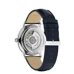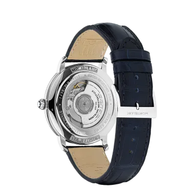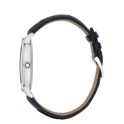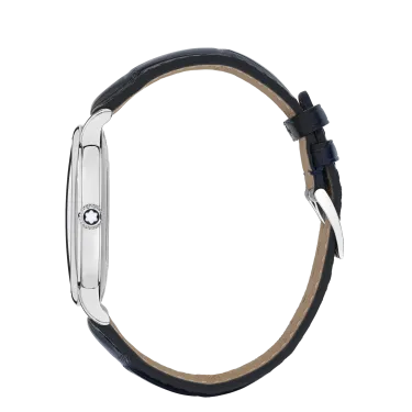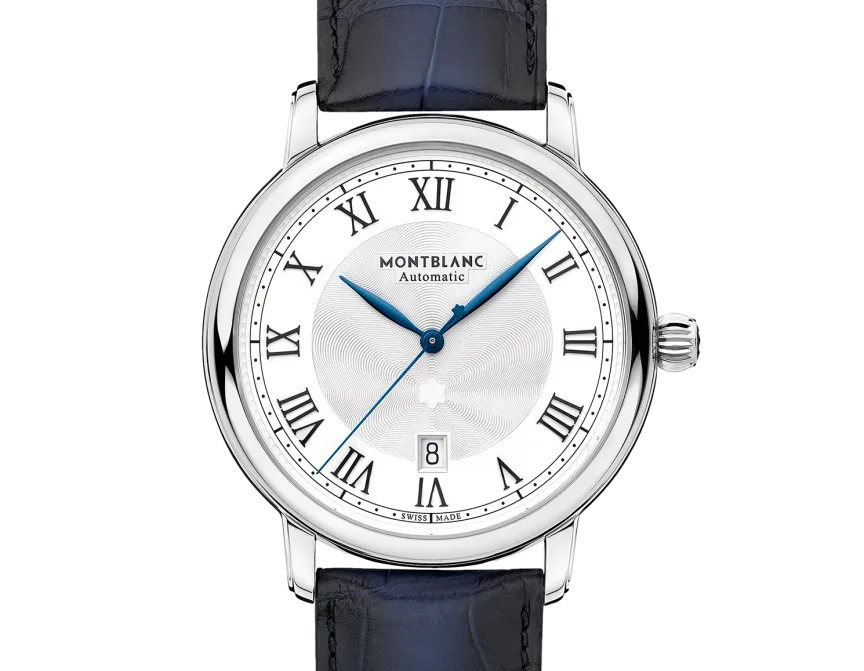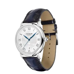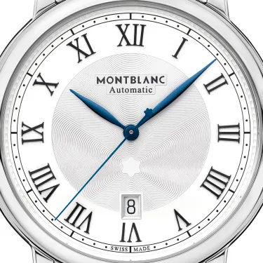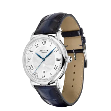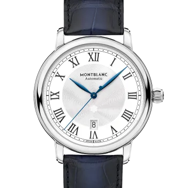 The Montblanc Star Legacy collection draws inspiration from Minerva's heritage and the pocket watches produced by the manufacture in the late 19th and early 20th centuries. True to the design codes of the line, the Montblanc Star Legacy Automatic Date watch features a refined silver-white dial adorned with the Montblanc motif representing concentric guilloché stars, Roman numerals, leaf hands, a guilloché filet sauté and a railway minute track. The watch is powered by the MB 24.09 automatic calibre and displays the hours, minutes and seconds in the centre, and the date in a window at six o'clock. It features a 42 mm stainless steel case and a trendy blue sfumato alligator leather strap.