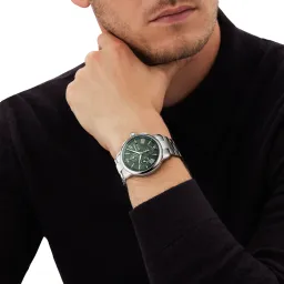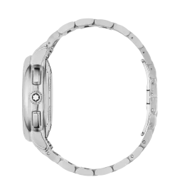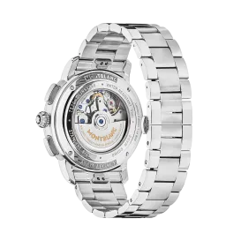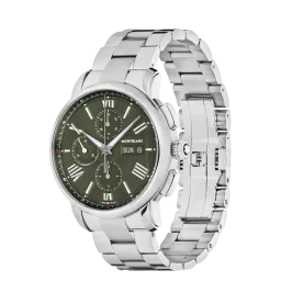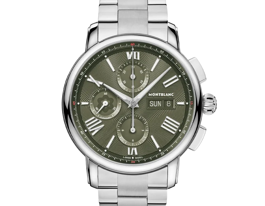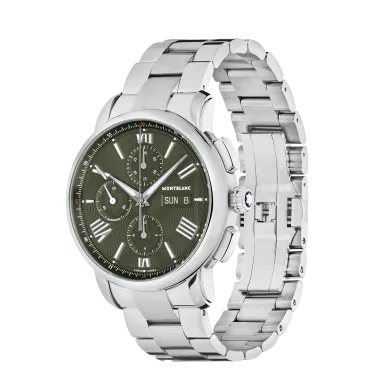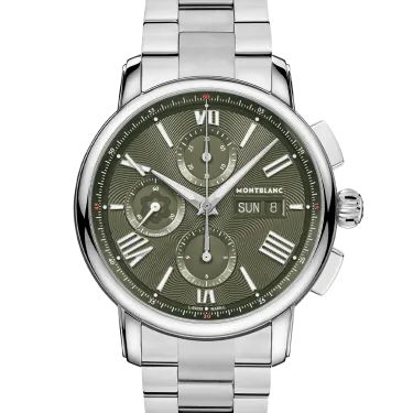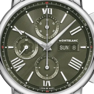 Featuring a round, polished pebble-shaped case and an onion-shaped crown, the Montblanc Star Legacy Chronograph Day & Date Limited Edition, limited to 800 pieces, is inspired by Minerva pocket watches from the late 19th and early 20th centuries. Its stunning green dial is adorned with Montblanc's signature concentric star motif, as well as rhodium-plated sword-shaped hands and numerals. It is powered by the MB 25.07 automatic movement, which includes a chronograph, weekday and date display. This timepiece also features an interchangeable stainless steel bracelet.