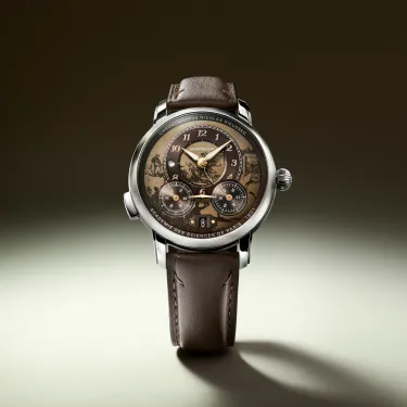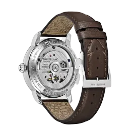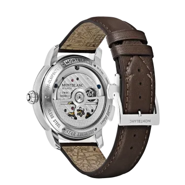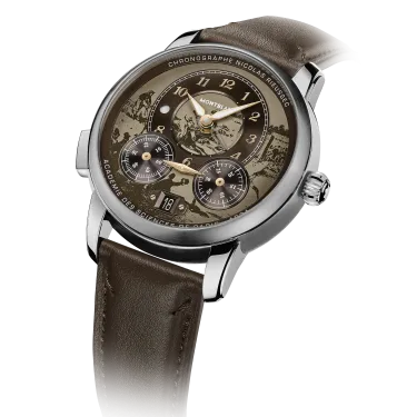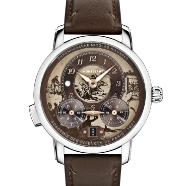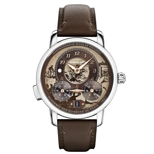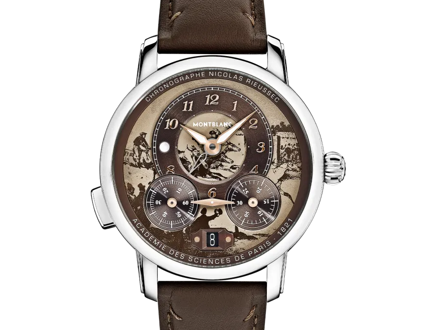 The Montblanc Star Legacy Nicolas Rieussec Chronograph invites you to relive the horse races on Champ-de-Mars in 1821. The dial depicts a 19th-century illustration showing four jockeys with their horses on the Champ-de-Mars circuit in Paris, crossing the finish line where Nicolas Rieussec used to be with his invention of the inking chronograph. A host of golden-coated touches present on the Arabic numerals, hour and minute hands, and chronograph counters perfectly complement the brown-toned dial. “Académie des Sciences de Paris” and “Chronographe Nicolas Rieussec” are engraved in French on the flange, as a reminder that the academy validated Rieussec’s invention in 1821. The lining of the strap has also been enhanced with a map of Paris from 1821. The brown calf leather strap has been specially designed by Montblanc’s Artistic Director Marco Tomasetta, who drew inspiration from the Maison’s writing instrument nibs for its pointed shape. Limited to 821 pieces, the timepiece comes in a 43 mm stainless steel case and is powered by the MB R200 automatic Manufacture monopusher chronograph movement. A graphic Clous de Paris motif, which originates from the geometric design of Paris’s cobbled streets, adorns the oscillating weight.