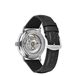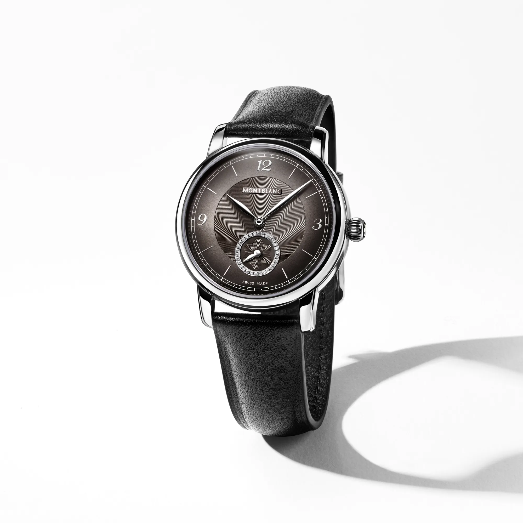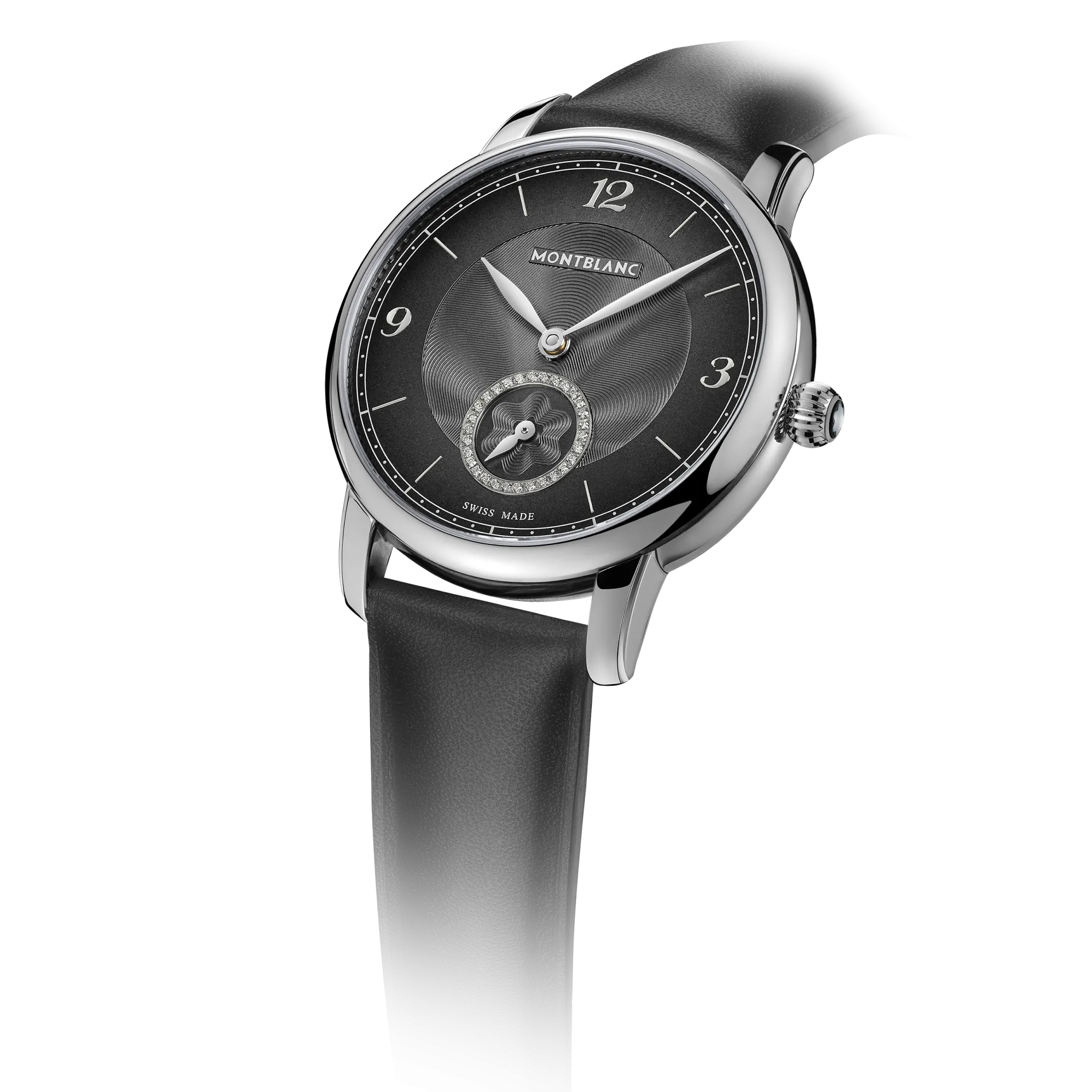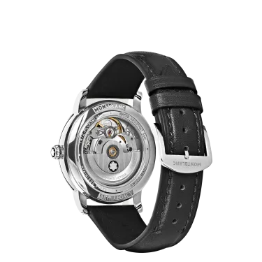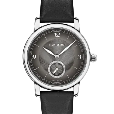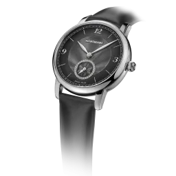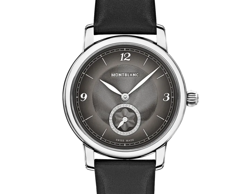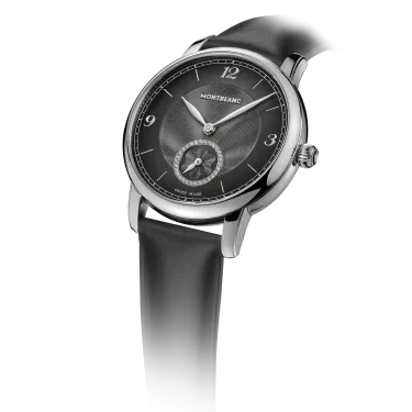 The Montblanc Star Legacy Automatic Small Second takes the Maison’s finest design codes to a new level of elegance. The timepiece presents a sfumato anthracite dial with exploding star guilloché motif, a filet sauté, rhodium-coated Arabic numerals, leaf-shaped hands and indicates the hours, minutes and seconds, highlighted by a counter set with 30 brilliant-cut diamonds (approx. 0.06 carats), in a simple yet elegant way. This model is powered by the MB 24.16 automatic movement and is housed in a 36 mm stainless steel, pebble-shaped case fitted with an open case back offering a view of the oscillating weight decorated with the Montblanc emblem. The black calf leather strap has been specially designed by Montblanc’s Artistic Director Marco Tomasetta, who drew inspiration from the Maison’s writing instrument nibs for its pointed shape.