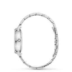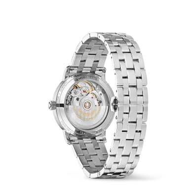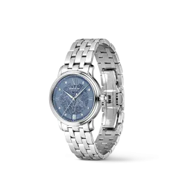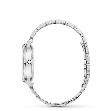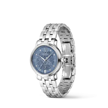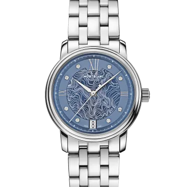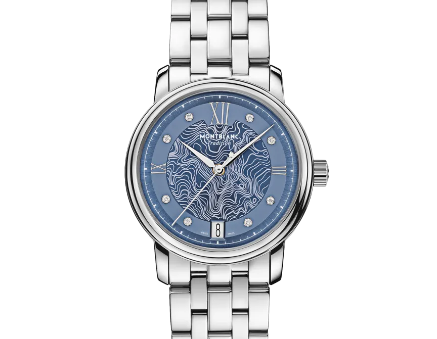 The Montblanc Tradition Automatic Date comes in a 32 mm stainless steel case with straight horns and a double-shaped bezel. The timepiece features a blue dial depicting the topography of the Mont Blanc with diamonds indexes, silver-coloured Roman numerals and a prominent Roman “XII”. The sword-shaped hour and minute hands, the seconds hand and crown with Montblanc emblem and the interchangeable stainless steel bracelet complete this contemporary elegant appearance.