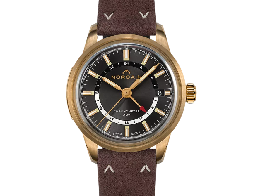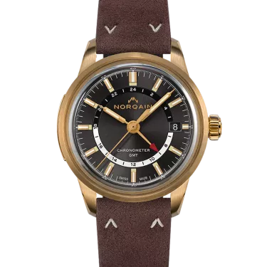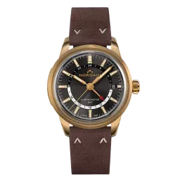 Anthracite domed dial with sunray finish, Second time zone with 24-hour indication in midnight black and white ring, Sandblasted flat indexes, bronze colour, with white printing and old radium Super-LumiNova® markers, Gold NORQAIN logo.