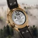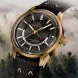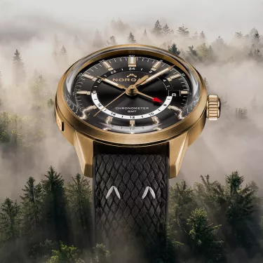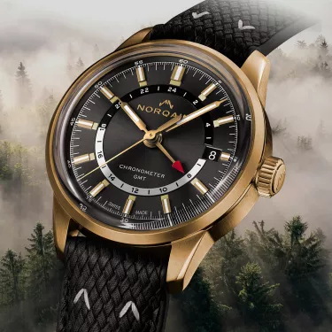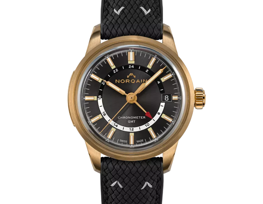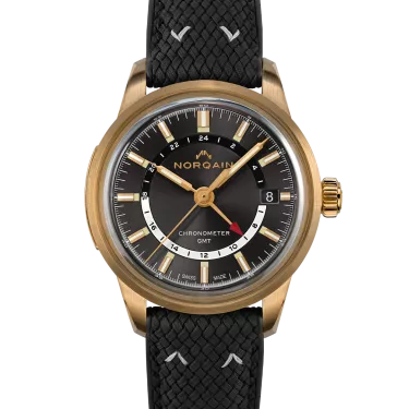 Anthracite domed dial with sunray finish, Second time zone with 24-hour indication in midnight black and white ring, Sandblasted flat indexes, bronze colour, with white printing and old radium Super-LumiNova® markers, Gold NORQAIN logo.