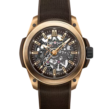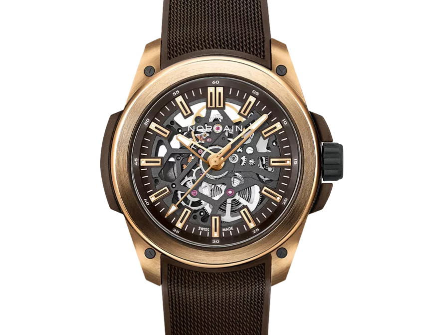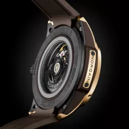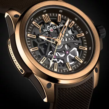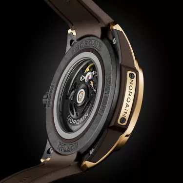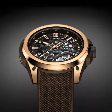The Wild ONE Skeleton Gold is the first Wild ONE Skeleton model to feature a solid 18ct “PX Impact®” 5N red gold top part of the revolutionary case construction. The bottom part is made of our proprietary, ultra-robust, and ultra-light NORTEQ® carbon fibre material developed in collaboration with Jean-Claude Biver, the NORQAIN team and the best Swiss suppliers. It comes with an integrated brown rubber strap with “Milanese” structure – 18 ct 5N red gold pin buckle.