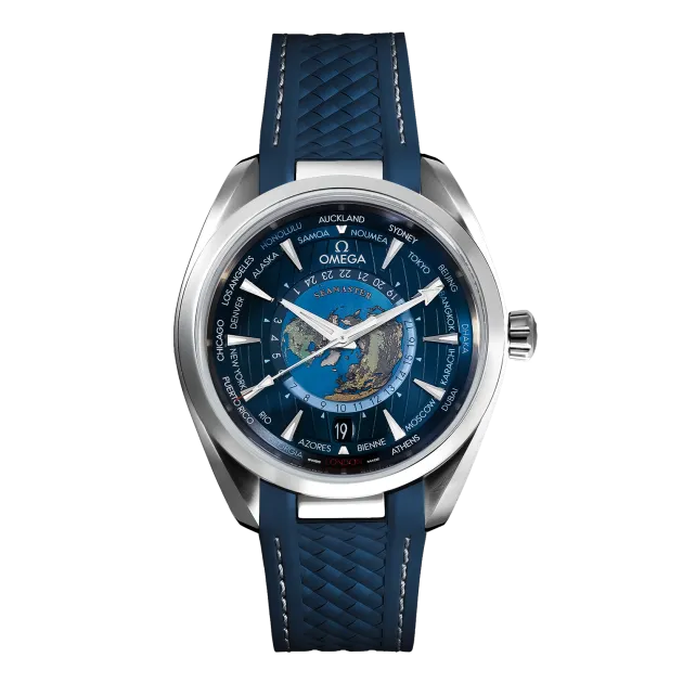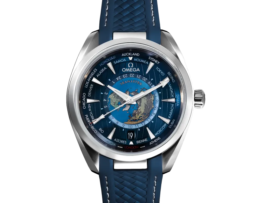 This Omega Seamaster Aqua Terra 150M has a stainless steel case and rubber strap. The exterior section of the dial is sun-brushed blue and includes vertical teak stripes and a circle of global destinations printed in red (GMT), silvery (+1h in summer) and blue (places without daylight savings). Domed scratch‑resistant sapphire crystal with anti‑reflective treatment on both sides. The centre of the dial contains a 24-hour glass ring, with Blue to indicate daytime and dark blue to indicate night.