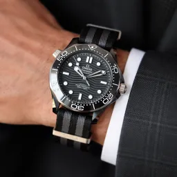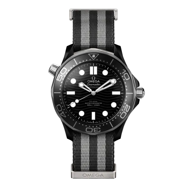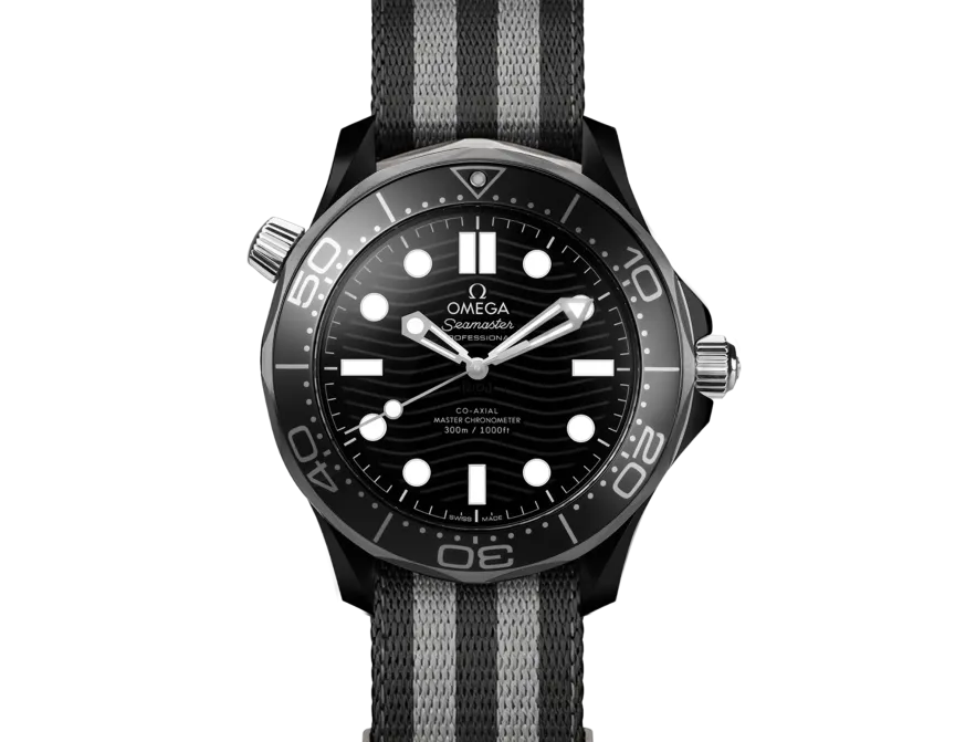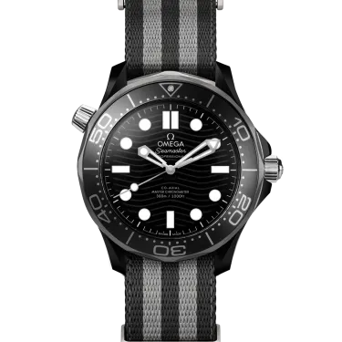 The case of this 43.5 mm model is crafted from black ceramic and grade 5 titanium and includes a black ceramic bezel with a white enamel diving scale. The dial is also brushed black ceramic [ZrO2] and features laser-engraving to create raised waves. The skeleton hands and raised indexes in PVD titanium are filled with white Super-LumiNova, while the helium escape valve has been given a conical design. The watch is presented on a 5-stripe black and grey NATO strap with a brushed buckle and titanium loop, and is driven by the OMEGA Master Chronometer Calibre 8806, which can be seen through the sapphire-crystal on the wave-edged caseback.