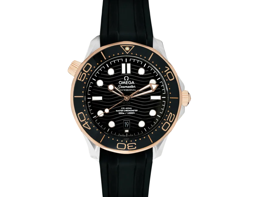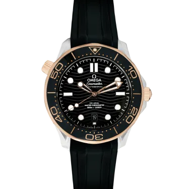 Omega Seamaster Diver 300M 42 mm is crafted from stainless steel and 18K Sedna™ gold, and includes a black ceramic bezel with a Ceragold™ diving scale. The dial is also polished black ceramic and features laser-engraved waves and a date window at 6 o’clock. The skeleton hands and raised indexes are 18K Sedna™ gold and are filled with white Super-LumiNova, while the helium escape valve has been given a conical design. The watch is presented on a black rubber strap and is driven by the OMEGA Master Chronometer Calibre 8800, which can be seen through the sapphire-crystal on the wave-edged caseback.