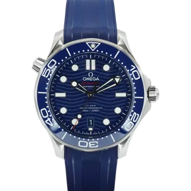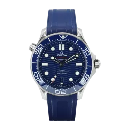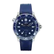 Omega Seamaster Diver 300M 42 mm is crafted from stainless steel and includes a blue ceramic bezel with a white enamel diving scale. The dial is also polished blue ceramic and features laser-engraved waves and a date window at 6 o’clock. The skeleton hands and raised indexes are rhodium-plated and are filled with white Super-LumiNova, while the helium escape valve has been given a conical design. The watch is presented on a blue rubber strap and is driven by the OMEGA Master Chronometer Calibre 8800, which can be seen through the sapphire-crystal on the wave-edged caseback.
