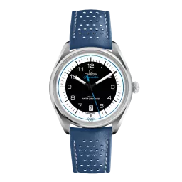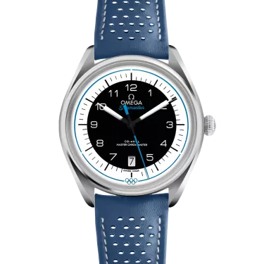The Seamaster Olympic Games Collection is inspired by the Rings of the Olympic Games and the design of OMEGA’s timekeeping stopwatches from the past. This 39.5 mm model has a stainless steel case and a blue, micro-perforated leather strap. The domed black and white dial includes sporty hands, a date window and an easy-to-read minute track, as well as a blue pulse reader that enables the wearer to calculate their pulse beats-per-minute. On the caseback, there is a blue anodized aluminium ring which includes all known host cities and dates from OMEGA’s Olympic Games journey, from Los Angeles 1932 up to Los Angeles 2028. Inside, the watch is driven by the Master Chronometer calibre 8800. Only 2,032 versions of this model have been created, with the Limited Edition number engraved on the side of the case.