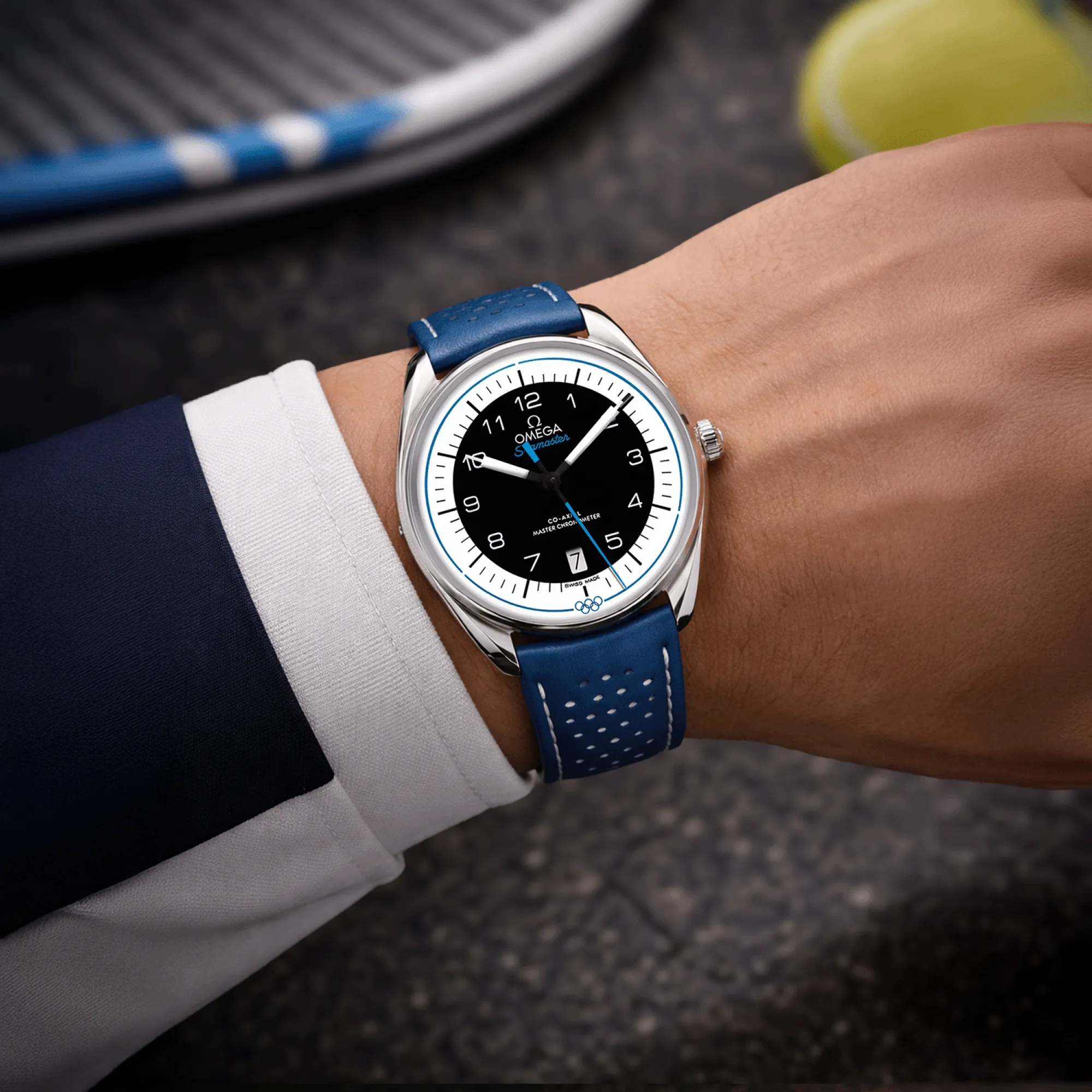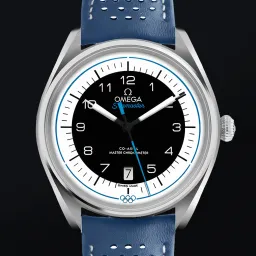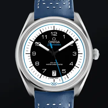 The Seamaster Olympic Games Collection is inspired by the Rings of the Olympic Games and the design of OMEGA’s timekeeping stopwatches from the past. This 39.5 mm model has a stainless steel case and a blue, micro-perforated leather strap. The domed black and white dial includes sporty hands, a date window and an easy-to-read minute track, as well as a blue pulse reader that enables the wearer to calculate their pulse beats-per-minute. On the caseback, there is a blue anodized aluminium ring which includes all known host cities and dates from OMEGA’s Olympic Games journey, from Los Angeles 1932 up to Los Angeles 2028. Inside, the watch is driven by the Master Chronometer calibre 8800. Only 2,032 versions of this model have been created, with the Limited Edition number engraved on the side of the case.