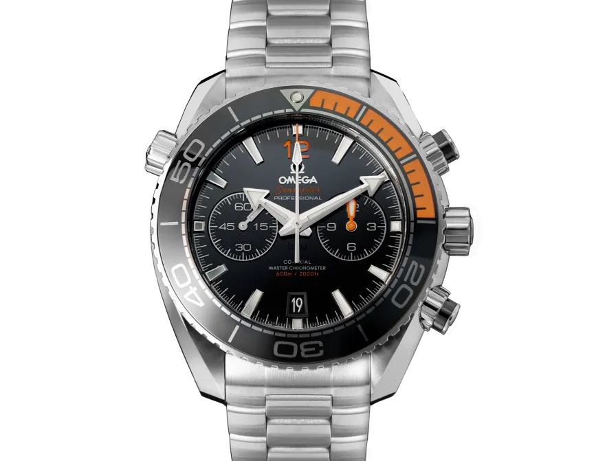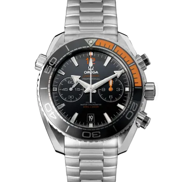 This model, with its scratch-resistant sapphire crystal, features a black ceramic dial with Arabic numerals and a date window at the 6 o’clock position. The dial presents a small seconds sub-dial, as well as 60-minute and 12-hour counters on one dial for intuitive reading of elapsed time. Mounted on the 45.5 mm stainless steel case, is the world's premiere black ceramic bezel with orange rubber. The diving scale of the bezel is crafted with Liquidmetal™. Other features include an alveol screw-in caseback and a stainless steel bracelet with patented extendable foldover clasp. The OMEGA Seamaster Planet Ocean 600M Master Chronometer Chronograph is water resistant to 60 bar (600 metres / 2000 feet), and has a helium-escape valve. The OMEGA Master Chronometer calibre 9900 at the heart of this timepiece can be seen through the transparent caseback. To achieve Master Chronometer status, it has passed the 8 rigorous tests set by METAS (The Swiss Federal Institute of Metrology).