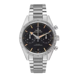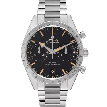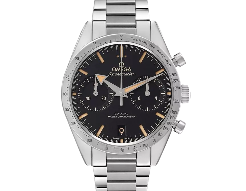 Omega Speedmaster '57 Co-Axial Master Chronometer Chronograph 40.5 mm Black Dial, Stainless Steel case, Stainless Steel strap, deployment with Foldover clasp. Silver tone hands and Index hour markers with minute markers around the outer rim and 2 sub-dials on a Black dial. Manual Wind movement. Calendar: Date at 6 o'clock. Chronograph sub-dials display: 60 Second, 12 Hours. Powered by Omega Calibre 9906 engine with 60 hours power reserve. Watch functions: Date, Power Reserve, Hour, Minute, Second, Chronograph. Scratch Resistant Sapphire crystal. 50 Meters - 165 Feet water resistant.