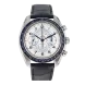 Stainless steel case with a blue (alligator) leather strap. Fixed stainless steel bezel with an inlaid blue aluminium ring showing tachymeter markings. Silver dial with blue hands and Arabic numeral hour markers. Telemeter markings and pulsometer scale around an inner ring. Minute markers. Minute markers around the outer rim. Dial Type: Analog. Chronograph - two sub-dials displaying: 60 second and 12 hour. Omega calibre 9908 hand wind movement. Scratch resistant sapphire crystal. Pull / Push crown. Transparent case back. Round case shape. Case size: 43 mm. Band width: 21 mm. Water resistant at 50 meters / 165 feet. Functions: chronograph, hour, minute, second.