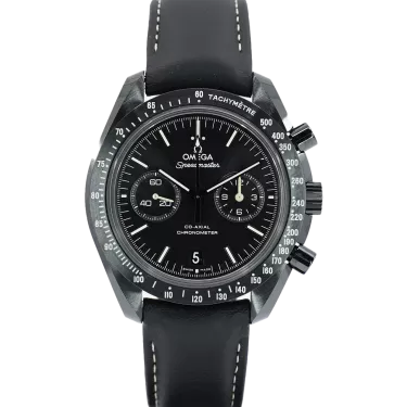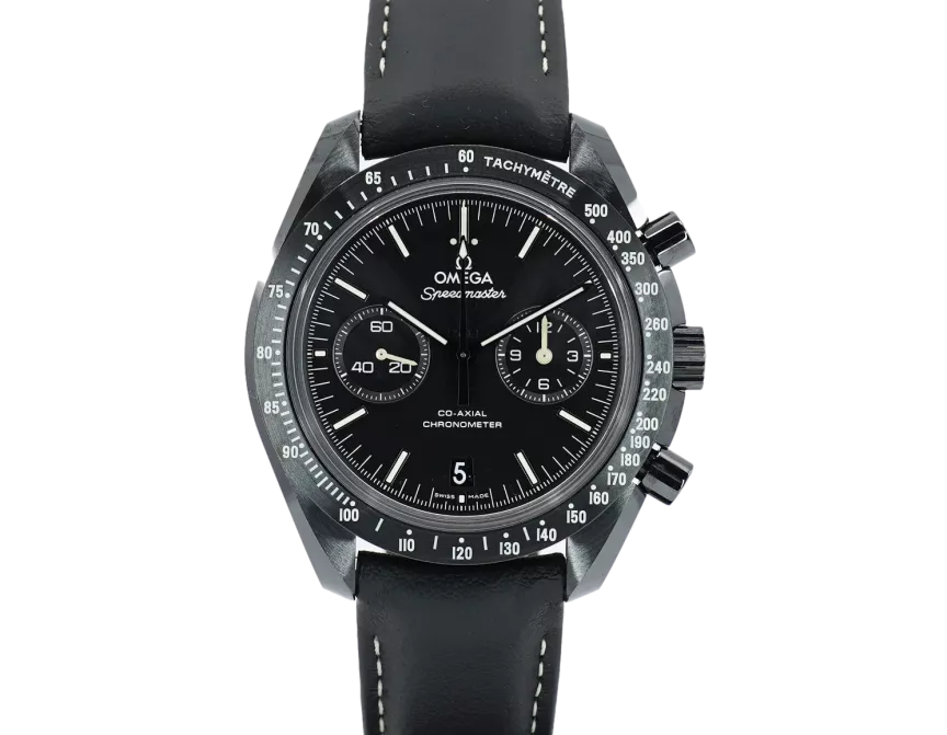 This 44.25 mm model has a polished and brushed ceramic casebody and a brushed ceramic bezel with a tachymeter scale in Super-LumiNova. It is distinguished by the Super-LumiNova that coats the indexes on its matt black ceramic dial. The matt black sub-dials have varnished hands. The "Pitch Black" is presented on a black leather strap with ecru stitching and a ceramic foldover clasp. At its heart is the OMEGA Co-Axial calibre 9300.