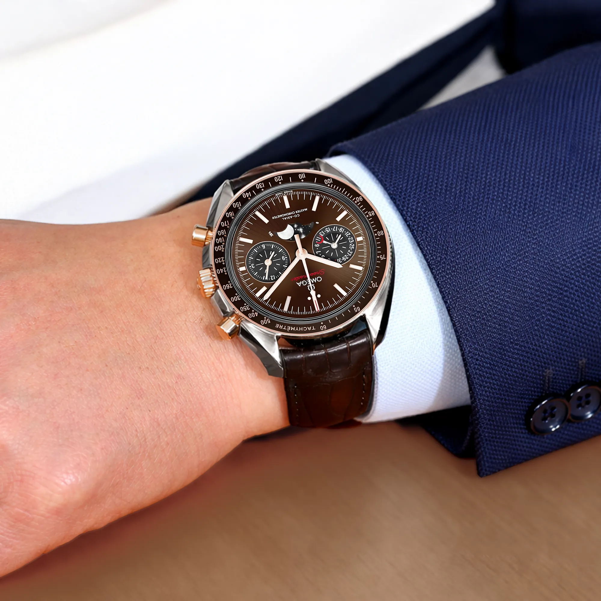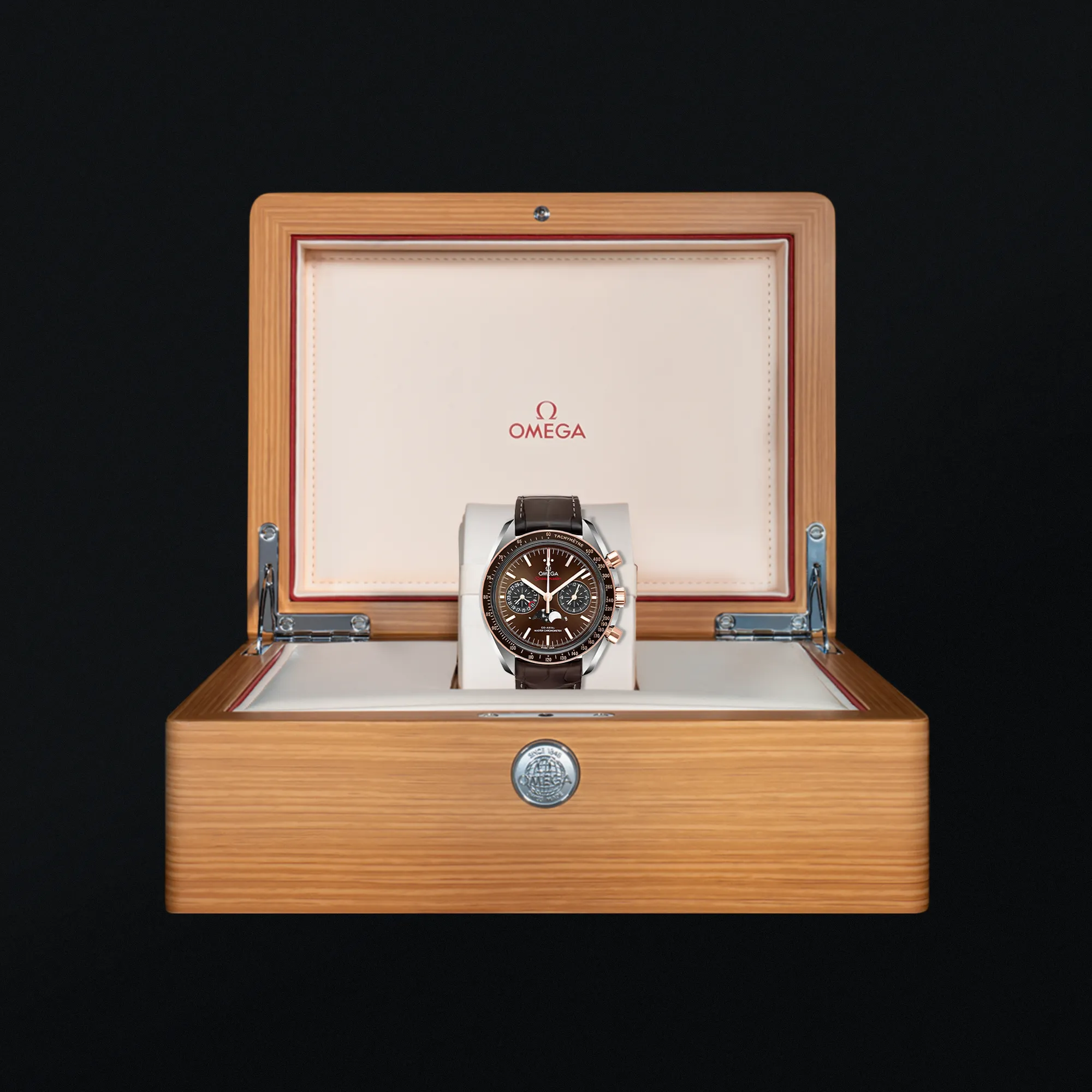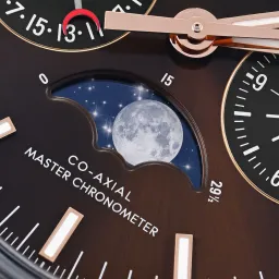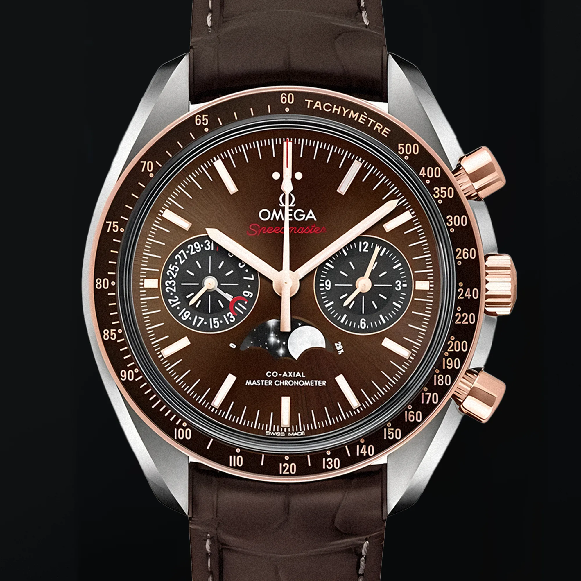 The Speedmaster is one of OMEGA’s most iconic timepieces, having been a part of all six lunar missions. Taking the spirit of exploration a step further, this new Moonphase features two infinitely small yet photo-realistic moons. This 44.25 mm model features a brown sun-brushed dial, with diamond polished 18K Sedna™ gold indexes and hands. At 6 o'clock is the accurate Moonphase indication, which features a metallic crystal disc microstructured to obtain a high resolution image of the moon. The stainless steel-18K Sedna™ gold case is complemented by a brown ceramic bezel ring with Ceragold™ tachymeter scale and presented on a brown leather strap with a polished-brushed foldover clasp. Powering the timepiece is the OMEGA Co-Axial Master Chronometer 9904, which has been officially certified by METAS.