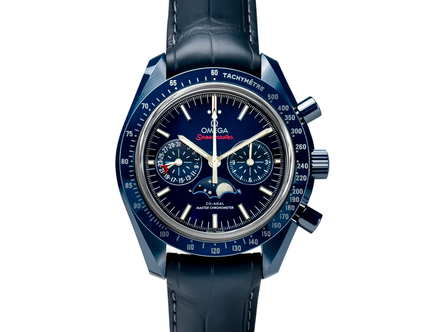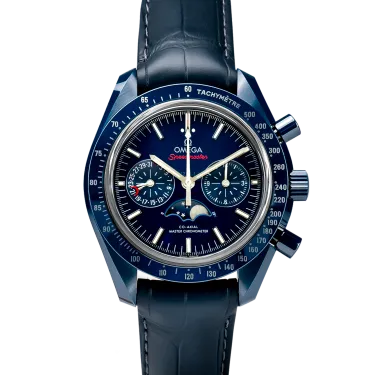 Omega Speedmaster Moonwatch 44,25 mm features a blue ceramic case complemented by a blue ceramic bezel ring with Liquidmetal™ tachymeter scale. It is presented on a blue leather strap with a blue ceramic, ceramised titanium foldover clasp. The blue ceramic dial includes 18K white gold indexes and hands. At 6 o'clock is the accurate Moonphase indication, which features a blue ceramic moonphase disc with near and far sides of the moon in LiquidMetal™. Powering the timepiece is the OMEGA Co-Axial Master Chronometer 9904, which has been officially certified by METAS.