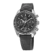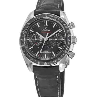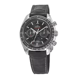 This 44.25 mm model features a black sun-brushed dial, with rhodium-plated indexes. At 6 o'clock is the accurate Moonphase indication, which features a metallic crystal disc microstructured to obtain a high resolution image of the moon. The stainless steel case is complemented by a black ceramic bezel ring with Liquidmetal™ tachymeter scale and presented on a black leather strap with a polished-brushed foldover clasp. Powering the timepiece is the OMEGA Co-Axial Master Chronometer 9904, which has been officially certified by METAS.
