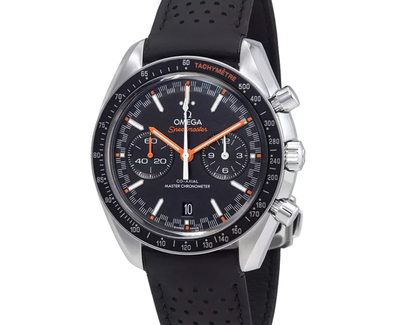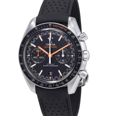 This Speedmaster Racing Master Chronometer model features a 44.25 mm stainless steel case with a black ceramic bezel ring that includes the famous tachymeter scale in orange wording and Liquidmetal™ numbers. The black leather strap is micro-perforated revealing an orange rubber interior.