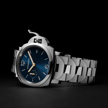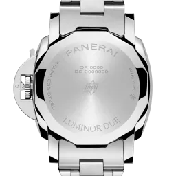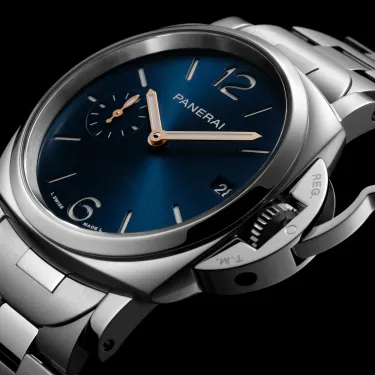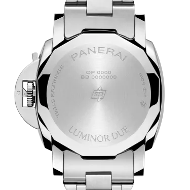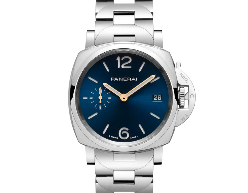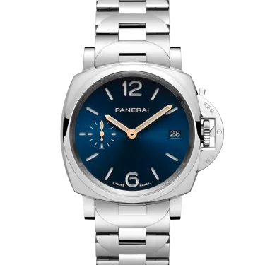 Panerai Luminor Due reference PAM01123, stainless steel, 38 mm case, waterproof up to 5 atm, sapphire crystal, automatic Cal.P900, hours, minutes, small seconds at 9 o'clock, date at 3 o'clock, blue sun-brushed dial with luminous Arabic numerals and hour markers. Date at 3 o'clock and small seconds at 9 o'clock., stainless steel strap, power reserve approx. 72 hours.