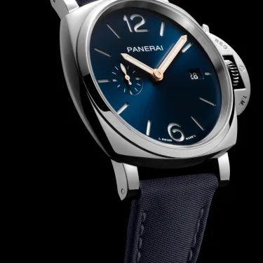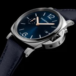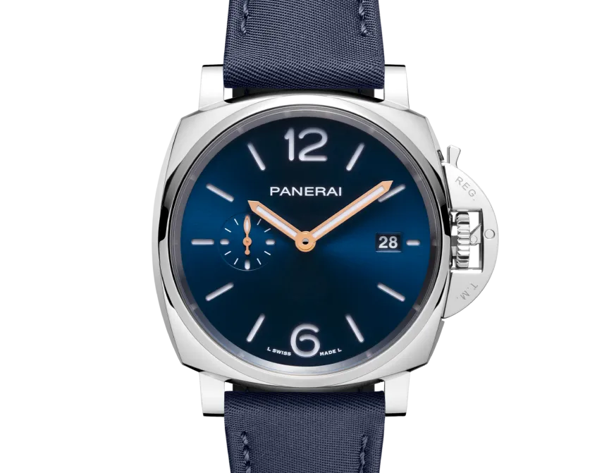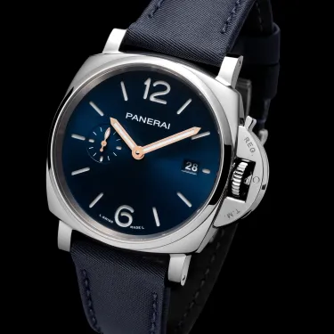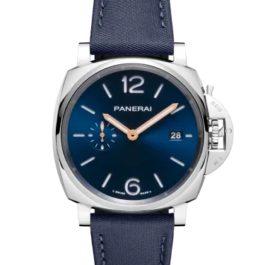 Automatic mechanical, P.900 calibre, 12 ½ lignes, 4.2 mm thick, 23 jewels, 28,800 alternations/hour. Incabloc® anti-shock device. Power reserve 3 days, one barrel. 171 components. 42mm polished steel case, Blue sun-brushed dial with luminous Arabic numerals and hour markers. Date at 3 o'clock and small seconds at 9 o'clock. "5.0 bar (~50.0 metres)" water resistance. Prada Re-Nylon Blue strap, T/T stitching, STD, 22/18, BA with Polished steel folding clasp, 18mm, PAM Click Release System™