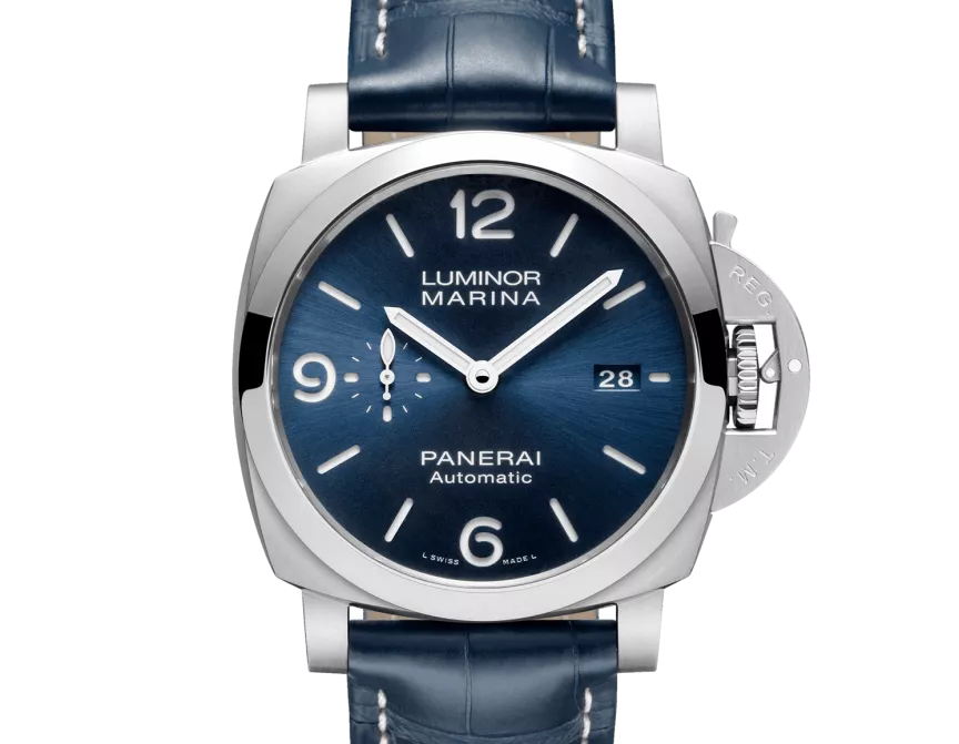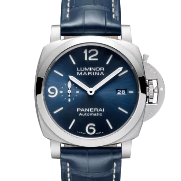 Panerai Luminor Marina reference PAM01313, stainless steel, 44 mm case, screwed back and crown with bow clasp, waterproof up to 30 atm, sapphire crystal, horn distance 24 mm, automatic Cal. P.9010, hours, minutes, small seconds, date, blue dial, luminous hands and markers, blue leather strap and a bluerubber strap with pin buckle. Secondary strap included - Dark Blue Rubber Strap.