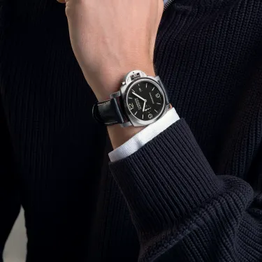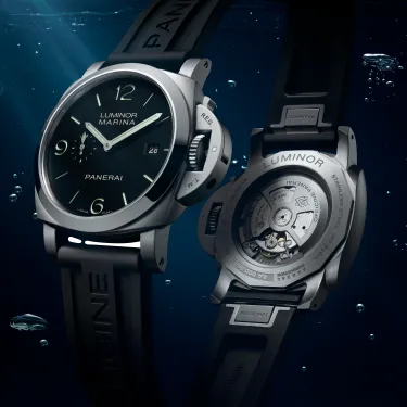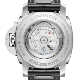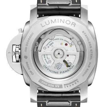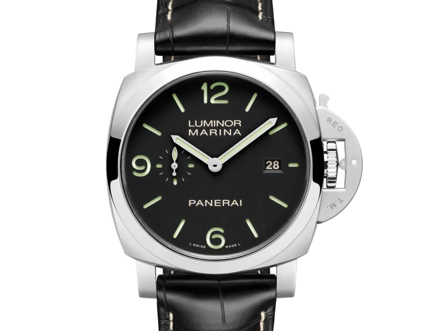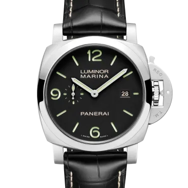 Panerai Luminor Marina 44 mm with functions hours, minutes, small seconds, date; brushed steel case; Polished steel bezel; Screwed, see-through sapphire crystal and steel back; Black dial with Grade X2 Super-LumiNova® Arabic numerals and hour markers. Date at 3 o'clock and small seconds at 9 o'clock; "50 bar (~500 metres)" water resistance; Black Alligator strap, ecru stitching, STD, 24/22, PAM Click Release System™, Trapezoidal brushed titanium buckle, 22mm, PAM Click Release System™. Secondary strap included - Black Rubber Strap.