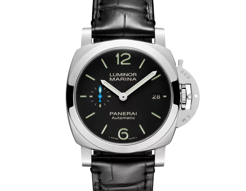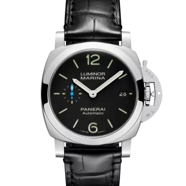 Panerai Luminor Quaranta reference PAM01372, stainless steel, 40 mm case, crown with bow clasp, waterproof up to 10 atm, sapphire crystal, horn distance 22 mm, automatic Cal. P.900, hours, minutes, small seconds, date, black dial, luminous hands and markers, black leather strap and a black rubber strap with pin buckle. Secondary strap included - Black Rubber Strap.