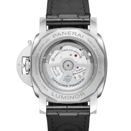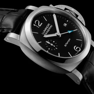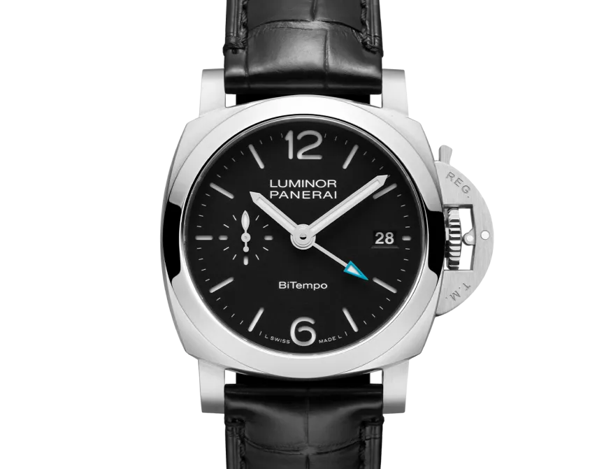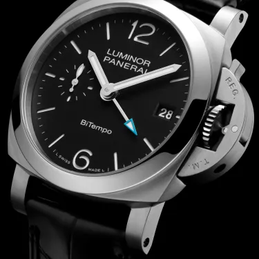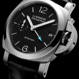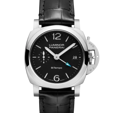 Panerai Luminor Quaranta BiTempo reference PAM01365, stainless steel, 40 mm case, crown with bow clasp, waterproof up to 10 atm, sapphire crystal, horn distance 22 mm, automatic Cal. P.900/GMT, hours, minutes, small seconds, date, black dial, luminous hands and markers, black leather strap and a black rubber strap with pin buckle. Secondary strap included - Black Rubber Strap.