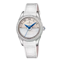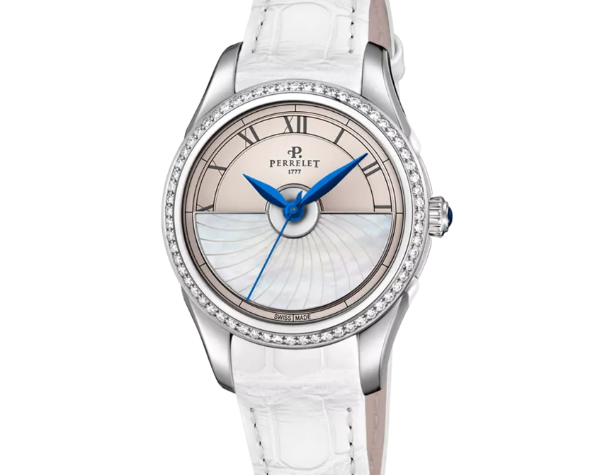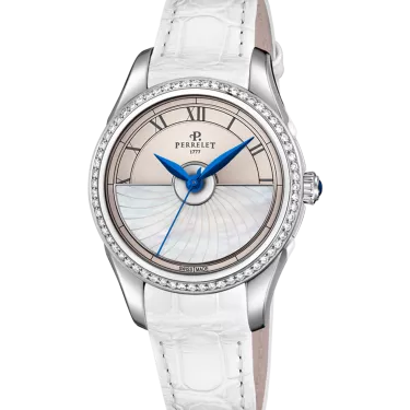 Perrelet enriches its ladies’ Diamond Flower line with a new model named Diamond Flower Amytis : collection designed “by women for women” and which combines a unique technique with brilliant expertise. This name evoking ancient history is inspired by the story of the hanging gardens of Babylon. The precious timepieces are equipped with the Double Rotor P-181-H caliber, patented by Perrelet and entirely produced within its Manufacture. In this collection, the rotor on the dial side depicts flower petals swaying in step with wrist movements. Each woman becomes actively involved in the poetic dynamics of her watch through her physical gestures. The mother-of-pearl, diamond, black, white or anthracite dials offer a delightful array of colors and contrasts that will elegantly accompany every woman in her daily life. Roman numerals converging towards the center add a final touch of character and originality to this collection. Functions central hands indicating hours, minutes and seconds; 5 ATM; Champagne dial - MOP double rotor, 64 diamonds (0,96ct), Top Wesselton VS1 dial and Deployment buckle. In-house automatic movement Calibre P-181-H, 42hours power reserve.