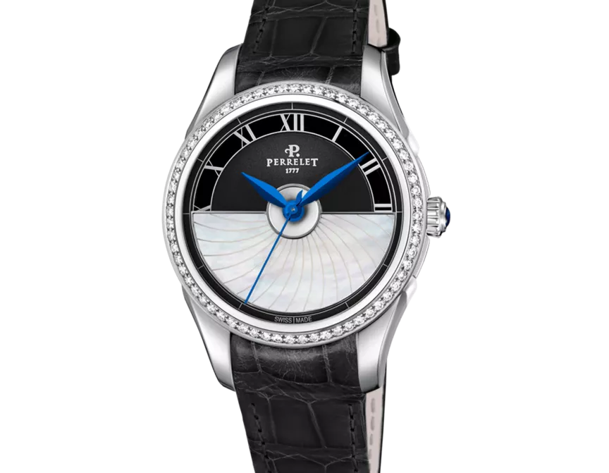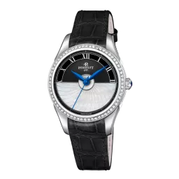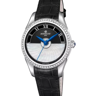 Perrelet enriches its ladies’ Diamond Flower line with a new model named Diamond Flower Amytis : collection designed “by women for women” and which combines a unique technique with brilliant expertise. This name evoking ancient history is inspired by the story of the hanging gardens of Babylon. The precious timepieces are equipped with the Double Rotor P-181-H caliber, patented by Perrelet and entirely produced within its Manufacture. In this collection, the rotor on the dial side depicts flower petals swaying in step with wrist movements. Each woman becomes actively involved in the poetic dynamics of her watch through her physical gestures. The mother-of-pearl, diamond, black, white or anthracite dials offer a delightful array of colors and contrasts that will elegantly accompany every woman in her daily life. Roman numerals converging towards the center add a final touch of character and originality to this collection. Functions central hands indicating hours, minutes and seconds; 5 ATM; Black dial - MOP double rotor, 64 diamonds (0,96ct), Top Wesselton VS1 dial and Deployment buckle. In-house automatic movement Calibre P-181-H, 42hours power reserve.