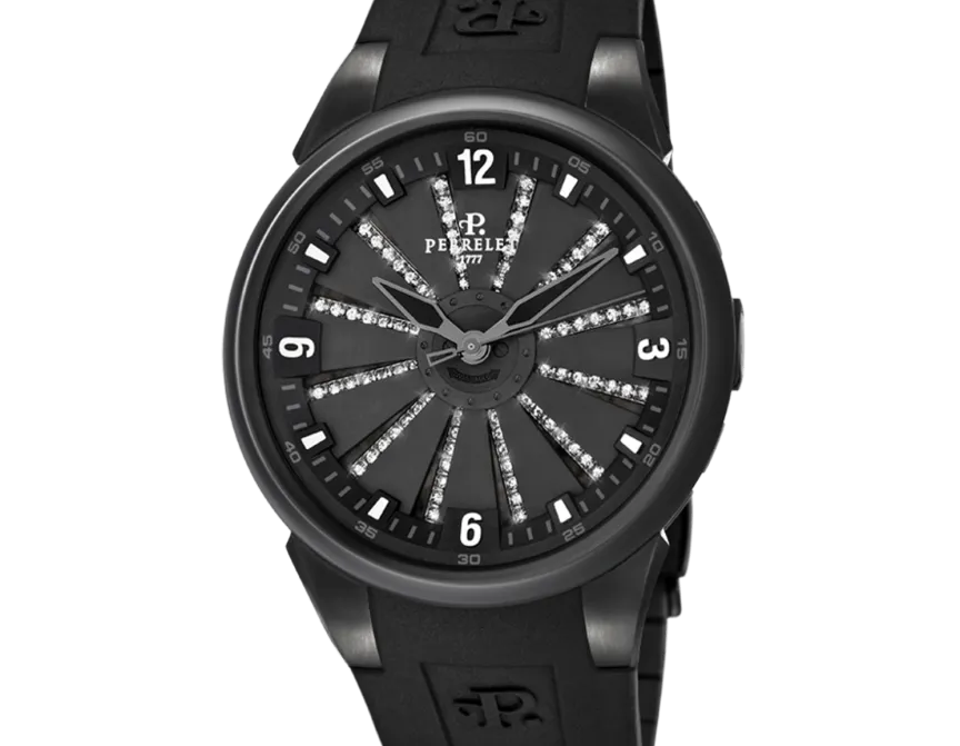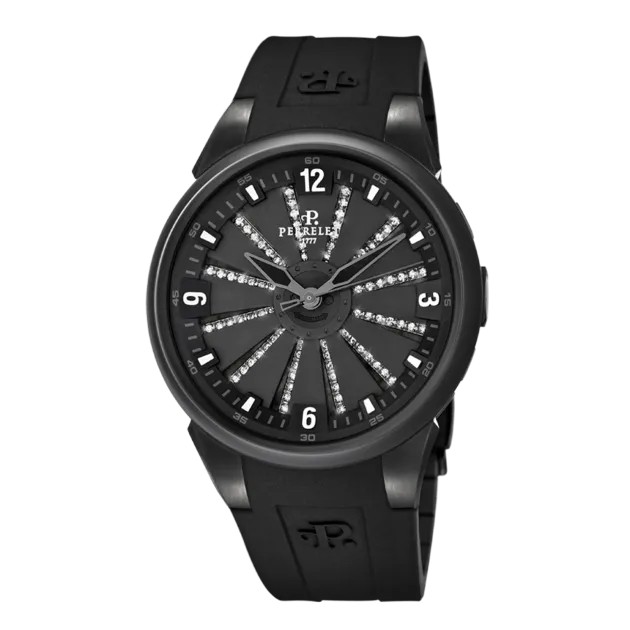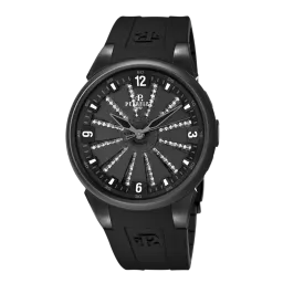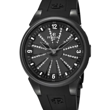 The Turbine Lady collection with its steel/PVD-coated steel case, available in 38 mm and 41 mm diameter, is imbued with a seductive sense of fascination and mystery. The turbine becomes the custodian of a precious treasure, since its rotation reveals the stunning beauty of an under-dial adorned with a sunray motif composed of exquisitely diamonds set. The Turbine Lady collection opts for classic black or white variations, each fitted with a matching rubber strap. Functions central hands indicating hours, minutes and seconds; 5 ATM; Black with 72 diamonds (0,36ct), Top Wesselton VS1 dial and Deployment buckle. In-house automatic movement Calibre P-331, 42hours power reserve.