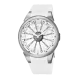 The Turbine Lady collection with its steel/PVD-coated steel case, available in 38 mm and 41 mm diameter, is imbued with a seductive sense of fascination and mystery. The turbine becomes the custodian of a precious treasure, since its rotation reveals the stunning beauty of an under-dial adorned with a sunray motif composed of exquisitely diamonds set. The Turbine Lady collection opts for classic black or white variations, each fitted with a matching rubber strap. Functions central hands indicating hours, minutes and seconds; 5 ATM; White with 72 diamonds (0,36ct), Top Wesselton VS1 dial and Deployment buckle. In-house automatic movement Calibre P-331, 42hours power reserve.