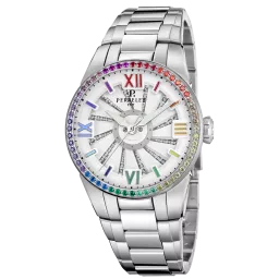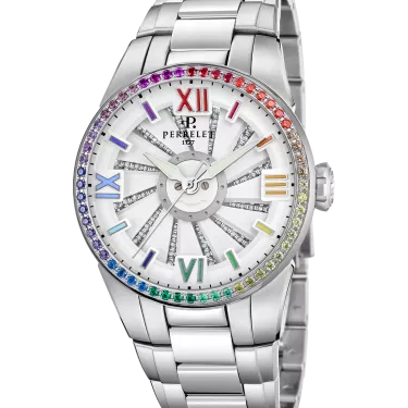 The Turbine Lady Aurora is a vibrant and colourful masterpiece that celebrates creativity and unique style. Its bezel set with 56 multi-coloured zircons arranged in a rainbow pattern captivates with its brilliance. The rainbow-hued turbine reveals a dial background decorated with diamonds, creating a spectacular play of light. The hour-markers and hands share the chromatic palette, accentuating the harmony of the design. Available with a rubber strap or steel bracelet, this model is ideal for women looking to stand out with a bold and exquisitely feminine timepiece.