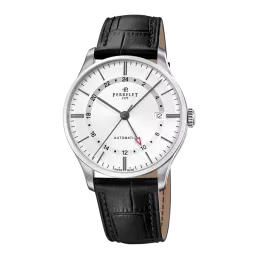 The Weekend line is faithful to the values that have always made this Swiss brand unique: excellence in manufacturing, in keeping with the demands of Swiss watchmaking tradition in both the technique and the decorations and finishing. With its sober and pure dial’s aesthetics the Weekend GMT offers an optimal legibility of the second time zone on 24 hours thanks to its red hand turning on the internal ring of the dial. Functions central hands indicating hours, minutes and seconds. Second time zone 24h. Date at 3 o'clock; 5 ATM; Domed silver laquered with index, sun brushed effect dial and Pin buckle. In-house automatic movement Calibre P-401, 42hours power reserve.