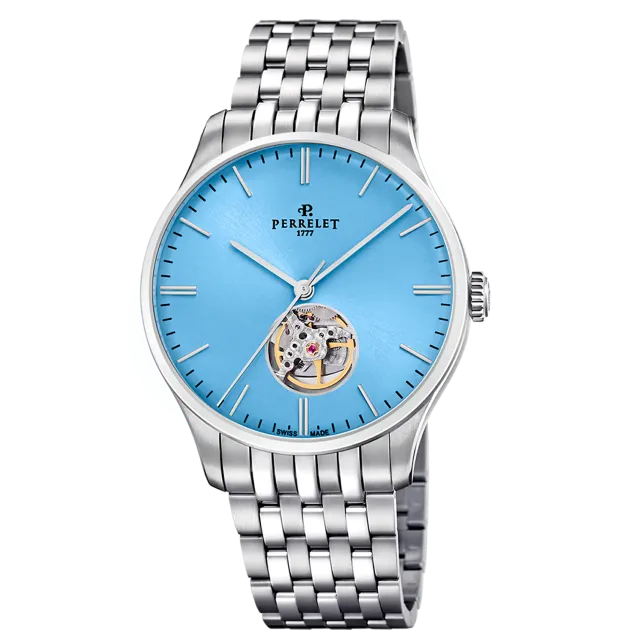 Powered by the Perrelet P-391 in-house caliber, composed of 92 parts and 25 jewels, and it has a power reserve of 42 hours. Thanks to the opening on the dial, located at 6 o'clock, it allows you to appreciate the beat at 28,800 A/h of this Swiss automatic movement. The screw-down case back is transparent and reveals the impeccable finish of the movement, its grained circular bridges, and the rhodium-plated oscillating weight decorated with the Maison's logo.