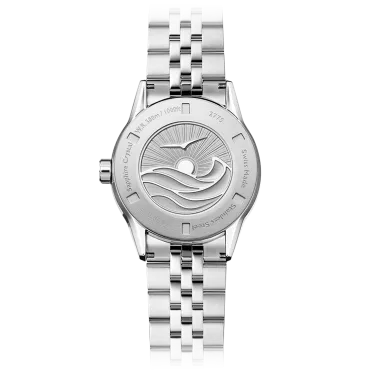 Equipped with a screwed-down case-back, the rear of the watch is engraved with a water landscape, representing the freedom felt on the water and the independent spirit and signature of RAYMOND WEIL.
