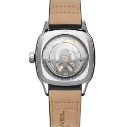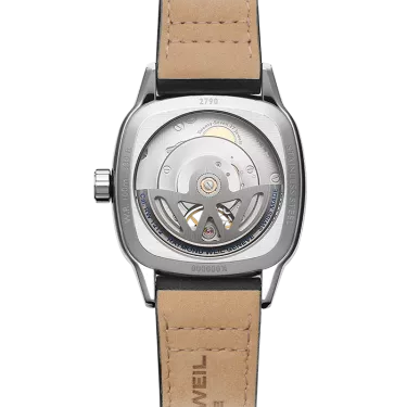 On the gradient dial, the Swiss-made automatic movement reveals itself through an open worked bridge. The Calibre RW1212 and the W-shaped oscillating weight, as a nod to the RAYMOND WEIL brand, can be admired through the exhibition caseback.
