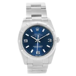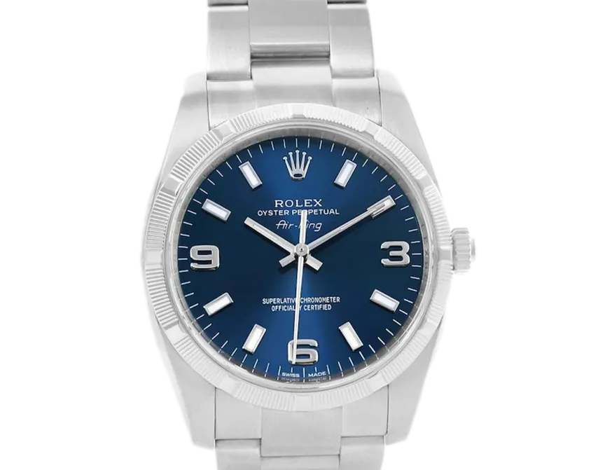Rolex Air-King 114210 34 mm, Stainless steel case, bezel and Oyster strap, Fold clasp, Blue dial, Automatic movement, Movement/Caliber 3130, 10 ATM water resistance with original box, original papers and is in perfect working conditions. This watch has been checked, certified and carried out the water resistance test and has 2-year warranty from the date of purchase.