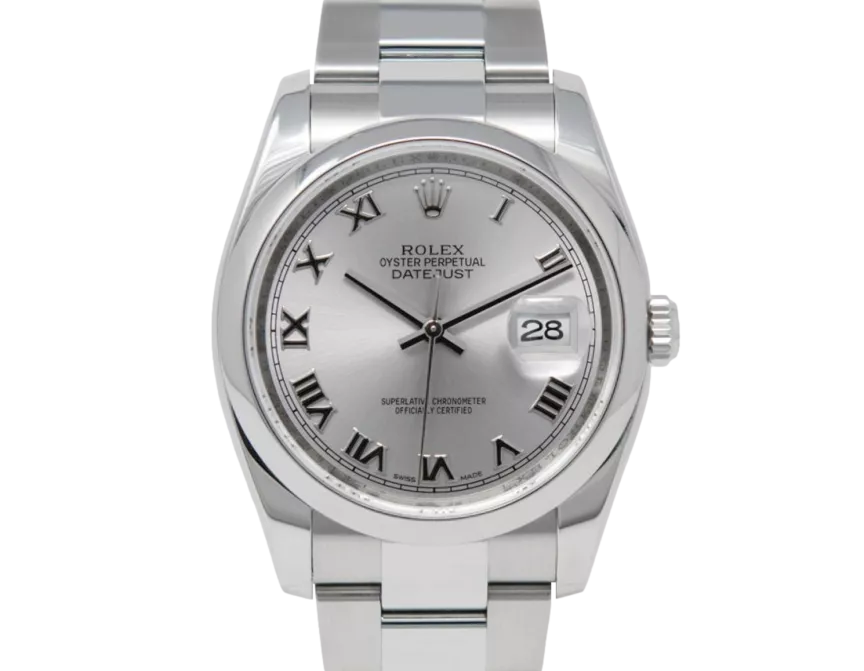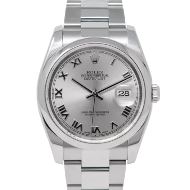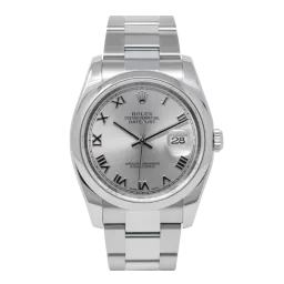 Rolex Datejust 116200 Movement : Automatic Case size : 36mm Case material : Steel Bracelet material : Steel (Oyster) Dial type : Rhodium Roman Numeral Water resistance : 100 Metres